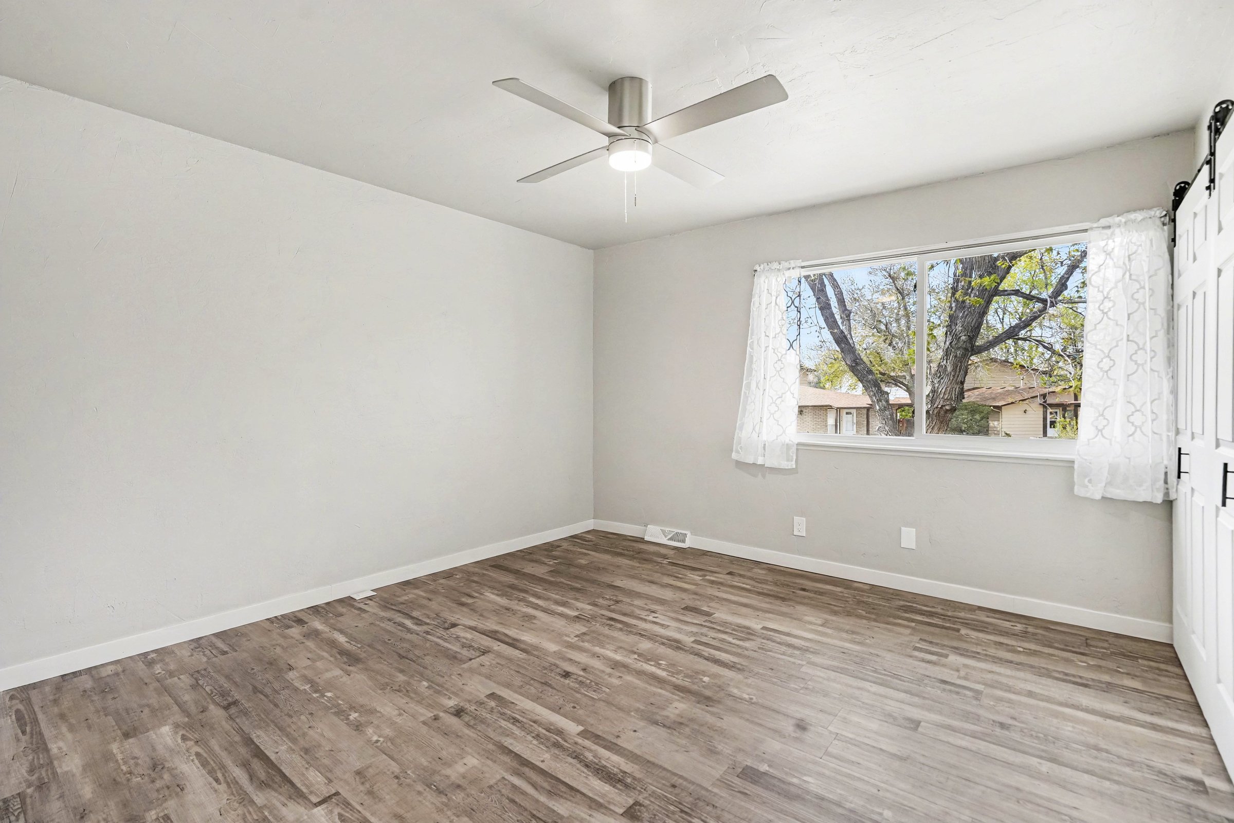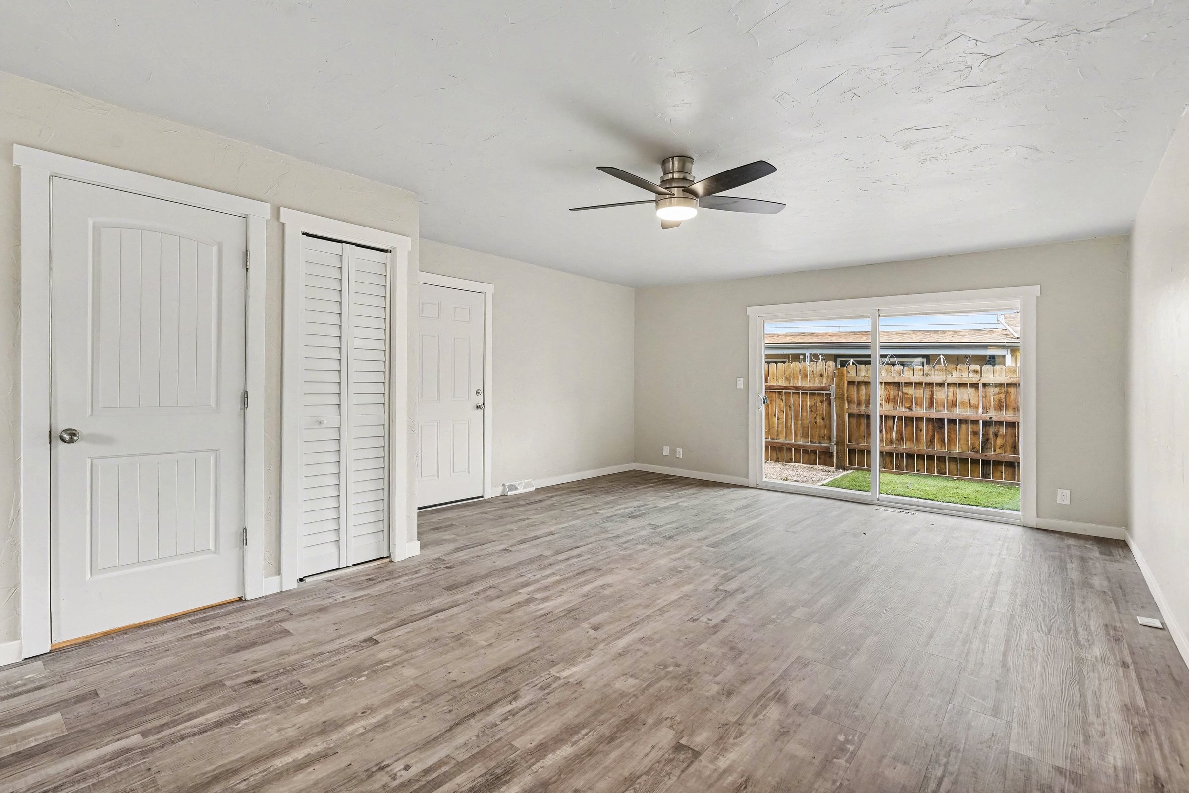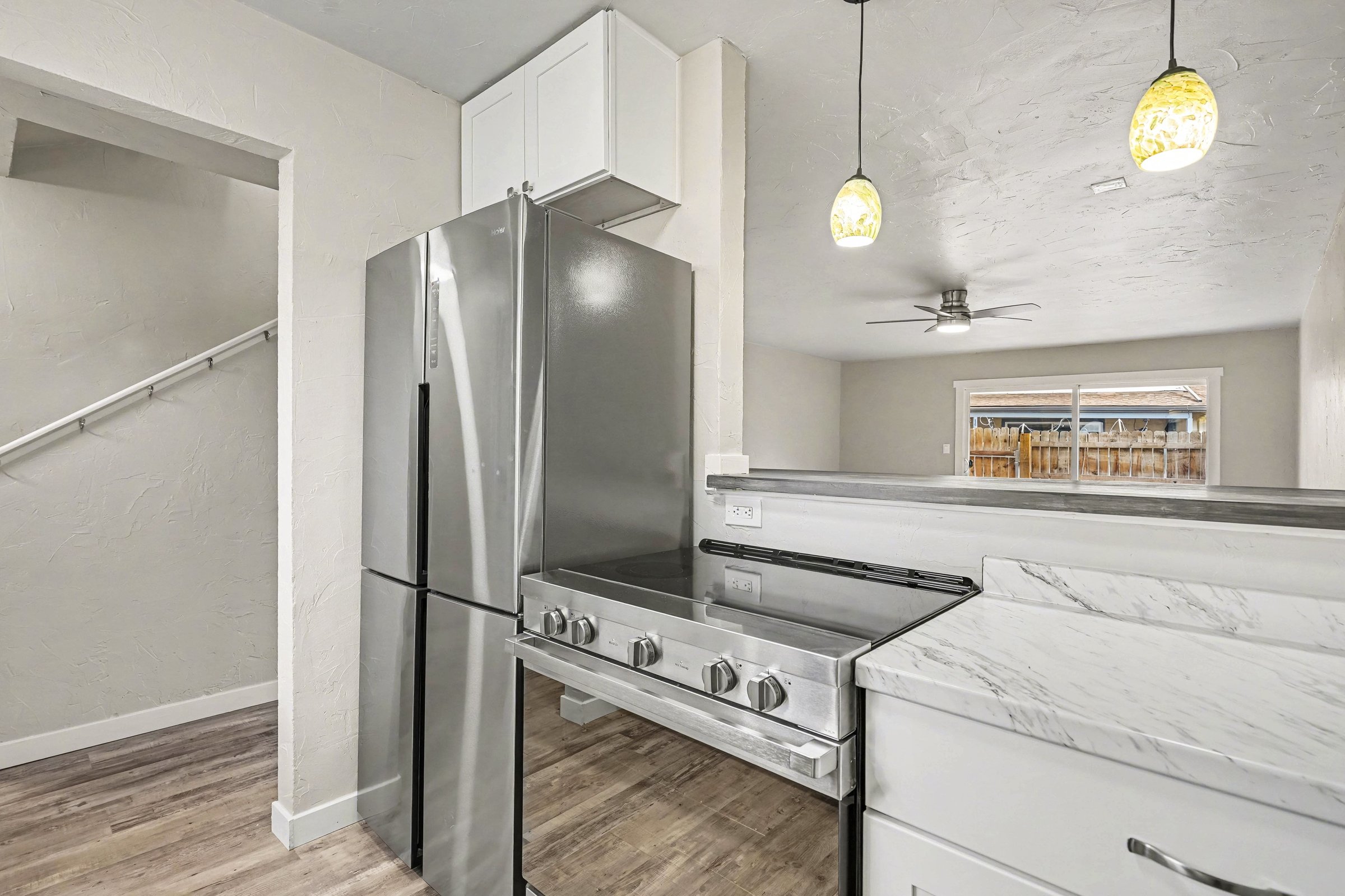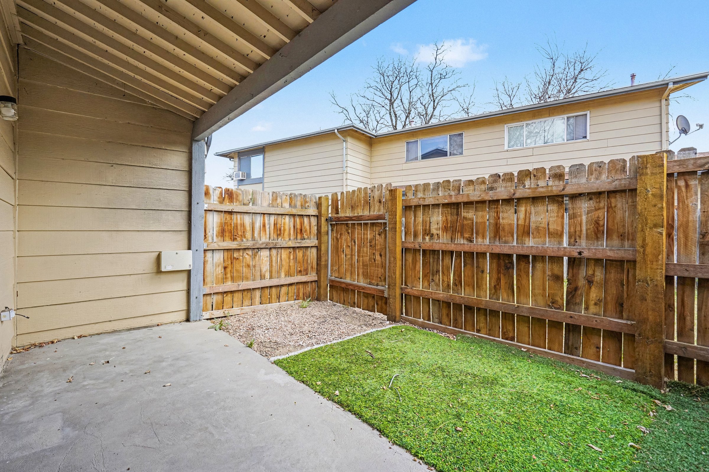 A renovated two-bedroom townhome in Denver's Welby corridor, where updated finishes meet practical everyday living across 1,024 square feet. The kitchen anchors the home with white shaker cabinets, marble-look quartz countertops, pendant lighting, and a full suite of stainless appliances including a gas range and dishwasher, a setup that holds its own well above the price point. The living area flows openly off the kitchen, with warm wood-look flooring throughout, a ceiling fan, and sliding doors that bring in natural light and lead directly to the covered patio. Built-in shelving adds character without consuming floor space, and a stacked in-unit washer and dryer is tucked away with no shared laundry, no laundromat runs. Upstairs, the bedrooms feature vaulted ceilings and wide windows framing tree-lined views, giving each room a lighter, more expansive feel than the square footage suggests. The primary bedroom is especially well-proportioned, with room for a full setup and solid closet access. Outside, a fenced yard with a covered patio offers private outdoor space, uncommon at this price in Denver. Quick access to I-25 makes commuting efficient, and Rotella Park is less than a mile away for weekend use. *Our homes come as-is with all essentials in working order. Want upgrades? Request it through the Belong app, and our trusted pros will take care of the rest!