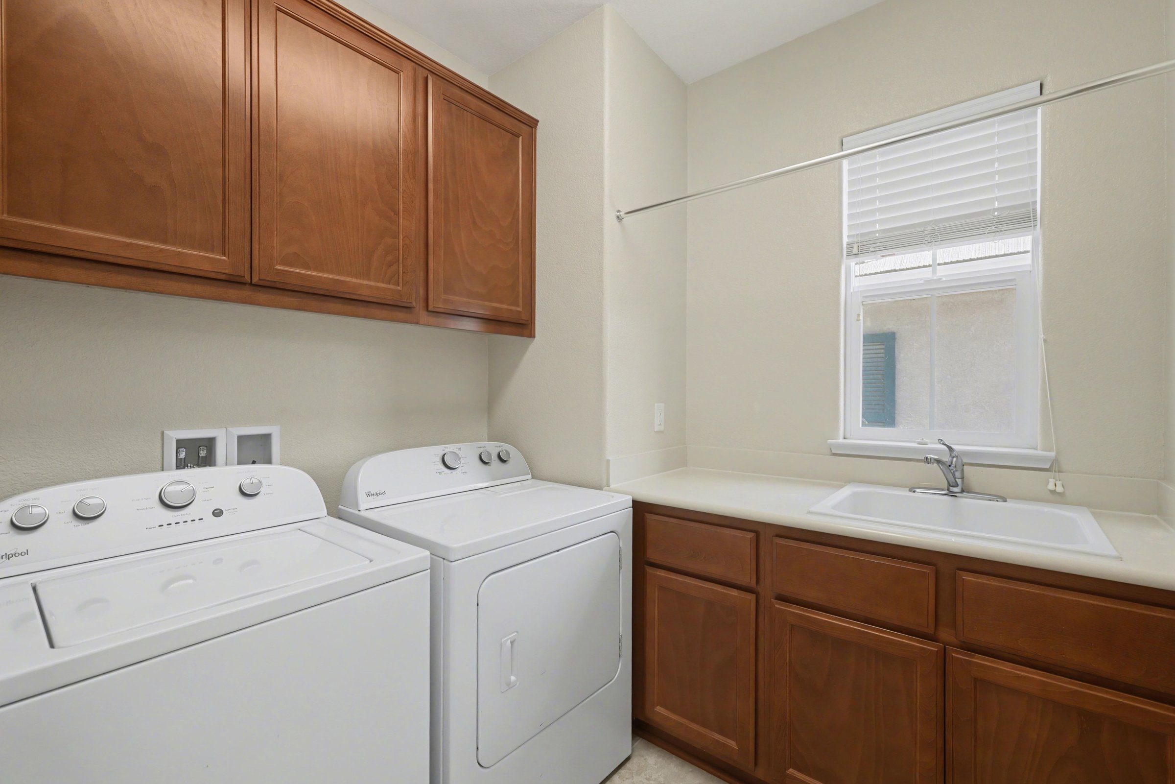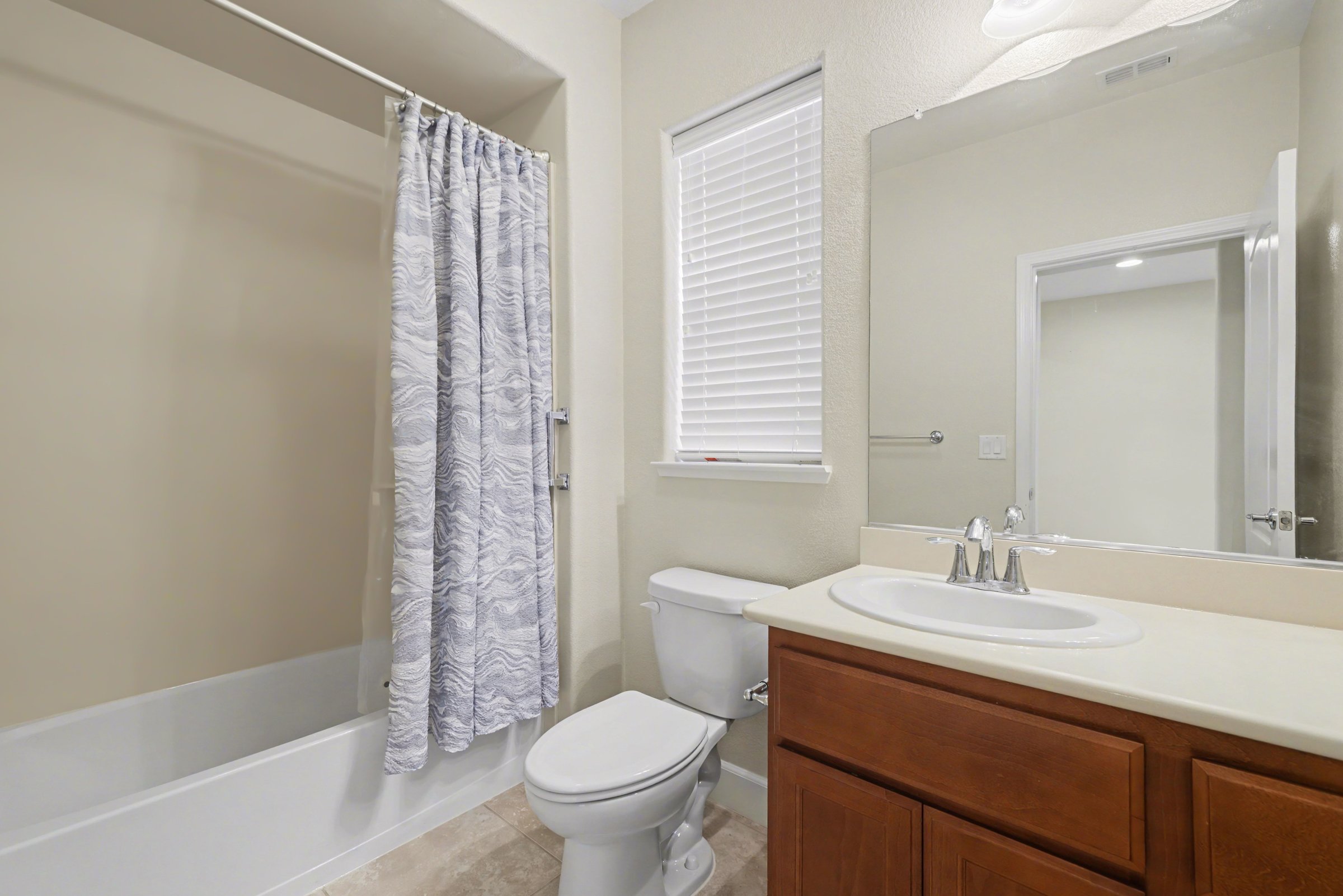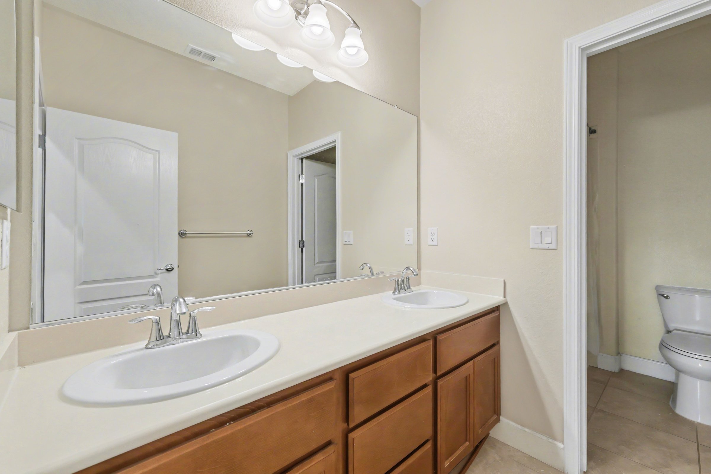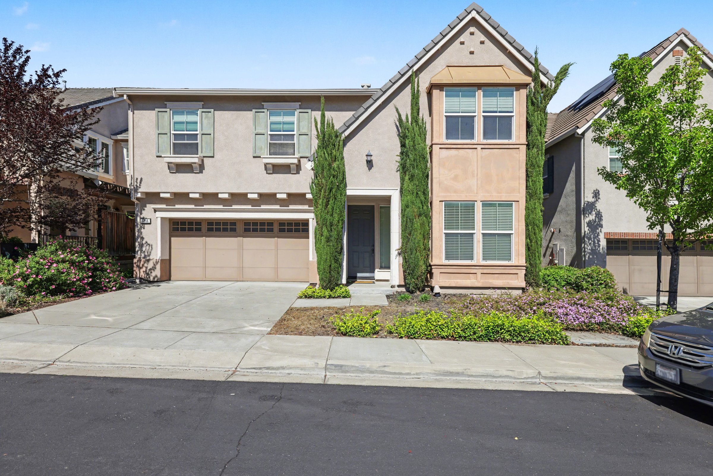 A two-story, 3,081-square-foot home in one of Dublin's most established residential pockets, 6856 Syrah Drive delivers the kind of space that's genuinely hard to find at the rental level: five bedrooms, a three-car driveway, and interiors that are clean, warm, and move-in ready. The kitchen is the clear center of the home: rich cherry cabinetry runs floor to ceiling, granite countertops wrap the perimeter, and a center island anchors the room without crowding it. Large windows pull in natural light and open views of the hills, the kind of kitchen that makes cooking and gathering feel easy. The tile floors and stone backsplash give it a grounded, quality feel throughout. Upstairs, the primary suite is genuinely oversized, with plush carpet, a wide footprint, and an ensuite featuring dual vanities, a soaking tub, and a glass-enclosed shower. The additional bedrooms offer flexible configurations for families, remote work, or guests, each with enough square footage to feel comfortable rather than incidental. Outside, the Mediterranean-style façade with cypress trees and landscaped beds gives the home strong curb presence. Just steps away, Lower and Upper Syrah Park are ideal for daily walks, and Wallis Ranch Community Park is minutes down the road. The Quarry Lane School is nearby for families with academic priorities, and Dublin's retail and freeway access keep the rest of the East Bay well within reach. *Our homes come as-is with all essentials in working order. Want upgrades? Request it through the Belong app, and our trusted pros will take care of the rest! *Fireplace is for decorative use only and cannot be used without consent from Belong.