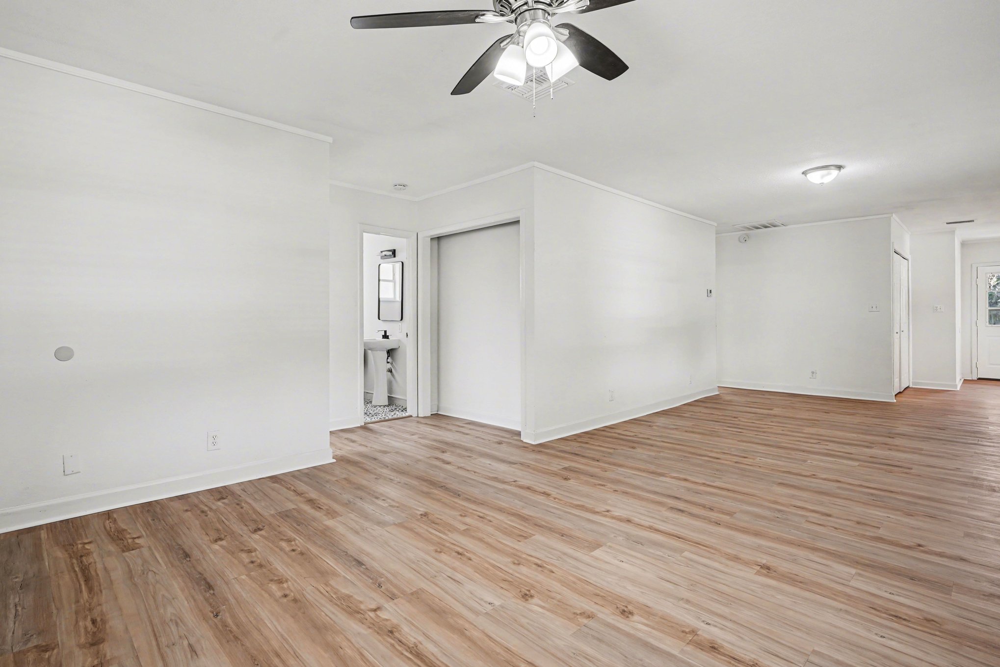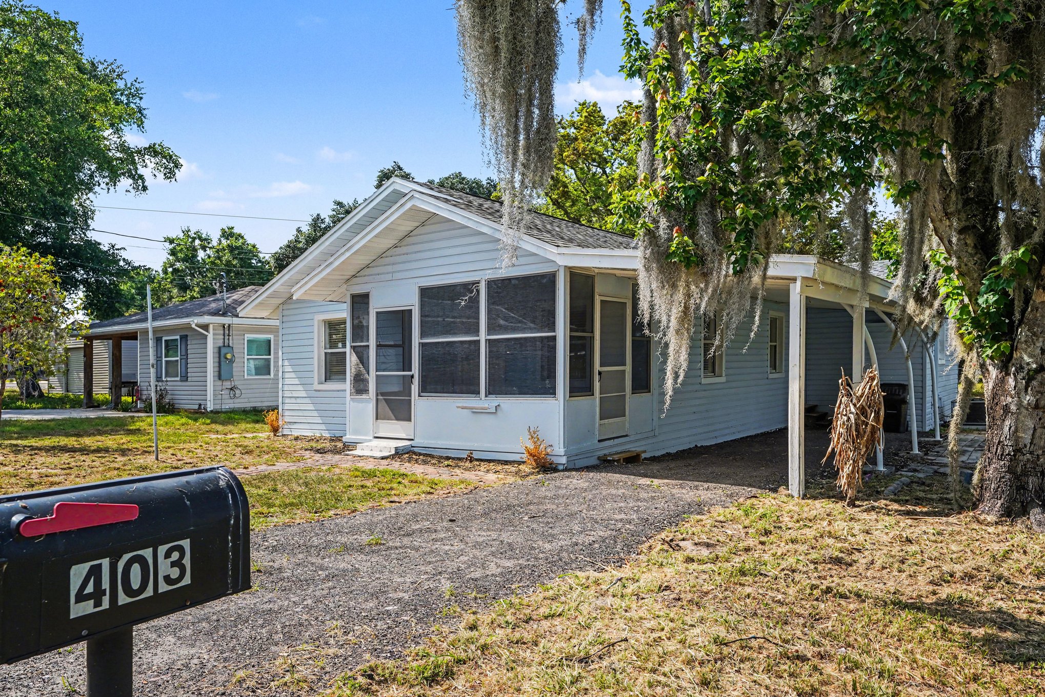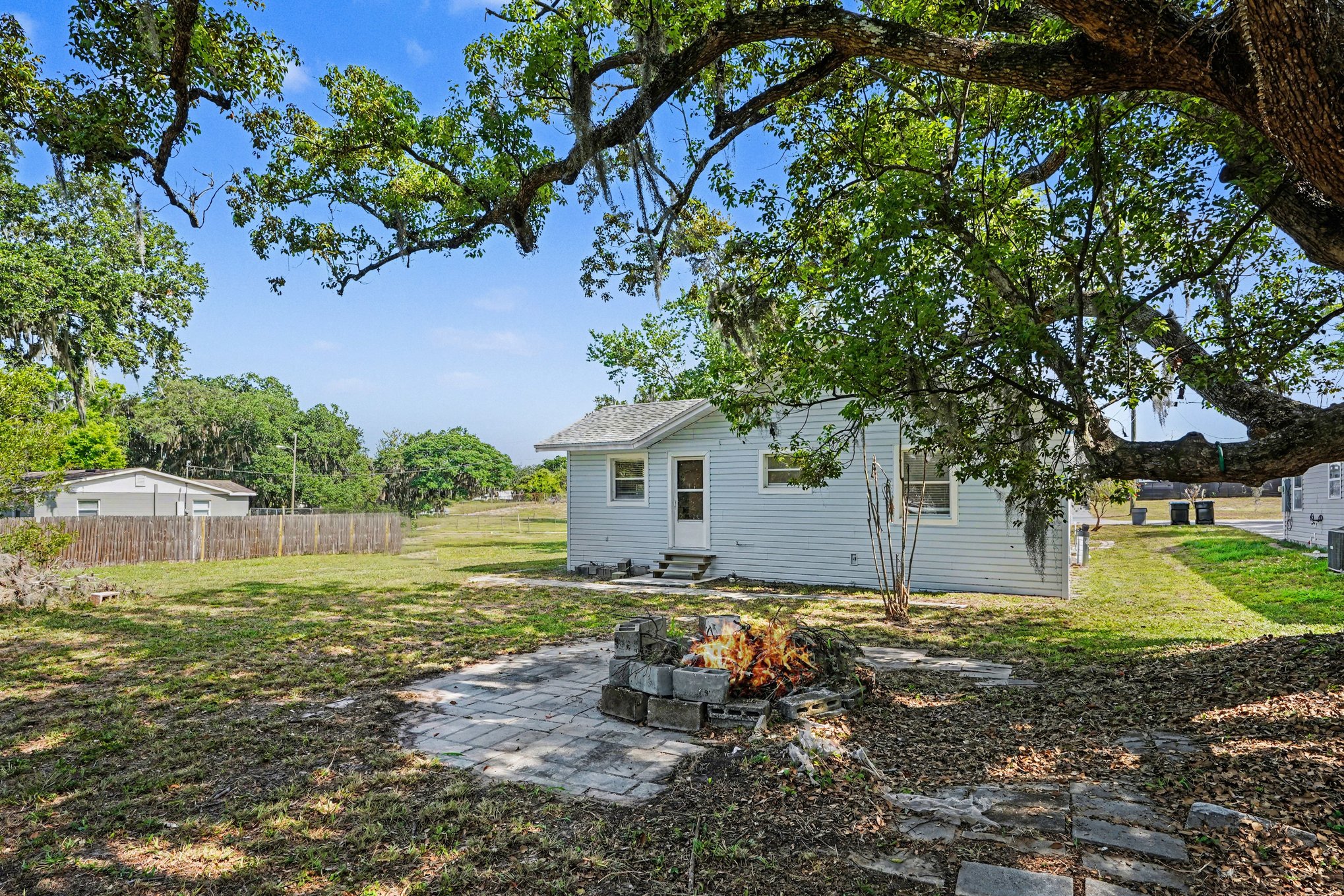 This freshly updated three-bedroom, two-bath home in Frostproof offers 1,326 square feet of comfortable living with a timeless Florida ranch style. The light blue-gray exterior and screened front porch welcome you to a spacious, well-maintained setting framed by mature trees draped in hanging moss. A covered carport along the asphalt driveway provides convenient shelter for your vehicle. Inside, the open layout is bright and airy with recessed lighting and multiple windows fitted with blinds. Wood-look laminate flooring flows throughout the living spaces, complementing the warm wood-stained cabinetry in the kitchen. Modern gray tile backsplash and clean white appliances blend functionality with understated style. Each bedroom features fresh paint, ceiling fans, and ample closet space for added convenience. Two full bathrooms ensure practical comfort for family or guests. Outside, generous grassy areas offer room to enjoy Florida’s climate, partially fenced for privacy and bordered by minimal landscaping that invites your personal touch. Set in a peaceful residential area, this home balances quiet suburban living with easy access to daily essentials. Experience the charm of a classic ranch home updated for today’s lifestyle. *Our homes come as-is with all essentials in working order. Want upgrades? Request it through the Belong app, and our trusted pros will take care of the rest!
