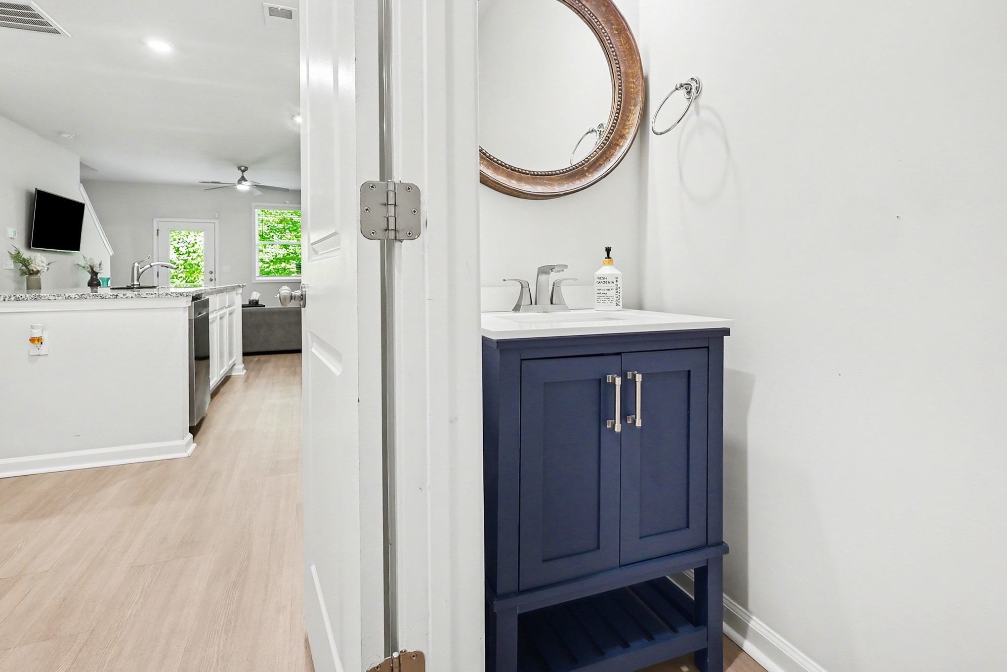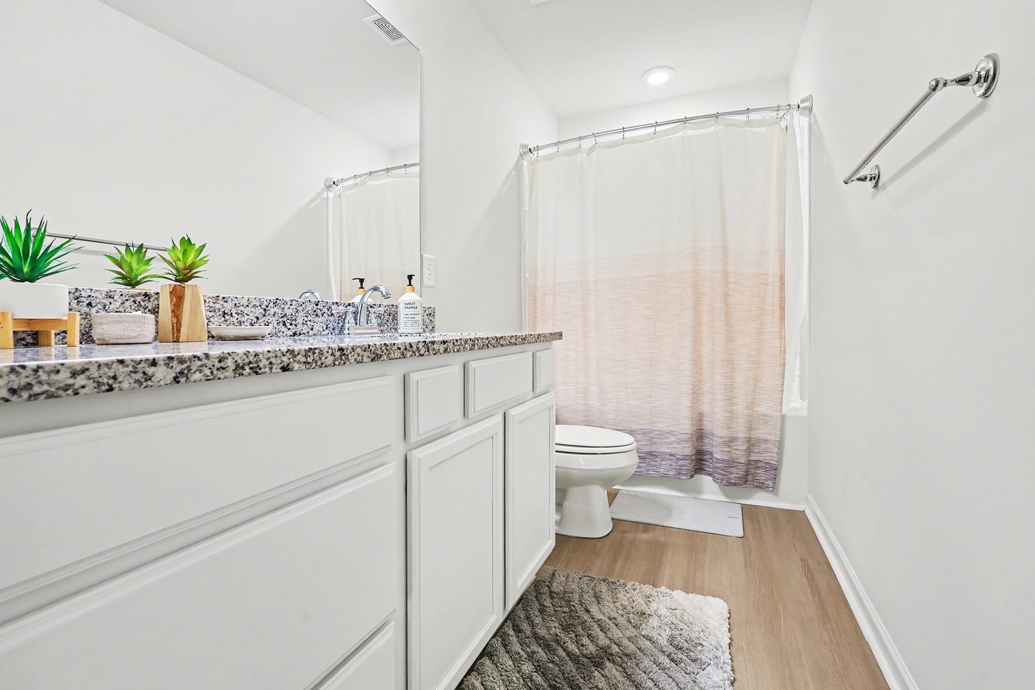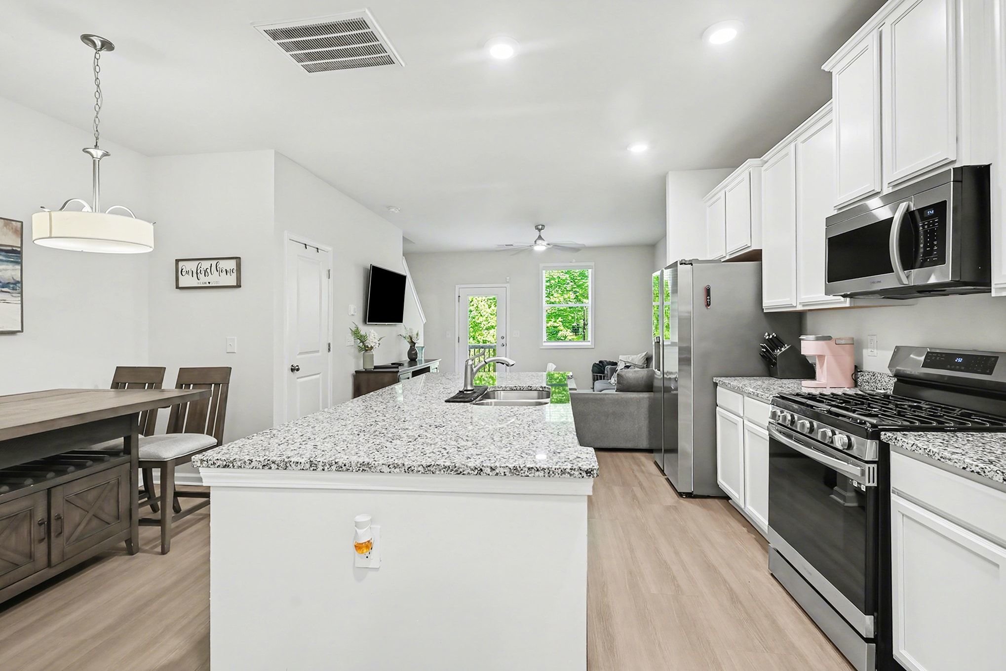 Tucked into a charming Greenville community, this two-bedroom, two-and-a-half-bath townhome offers 1,482 square feet of modern, low-maintenance living with stylish finishes throughout. A fresh exterior with crisp siding, shake accents, and a standout blue front door pairs with an attached one-car garage for both curb appeal and convenience. Inside, the open-concept main floor flows effortlessly between kitchen, dining, and living areas, all anchored by wide plank wood-style flooring and neutral walls. The kitchen impresses with white shaker cabinetry, speckled granite countertops, a full suite of stainless steel appliances including a gas range, and a spacious center island with pendant lighting. A dedicated dining area and a generously sized living room with ceiling fan and mounted TV space complete the downstairs layout. A stylish powder room with a navy vanity adds a designer touch for guests. Upstairs, the primary suite offers a ceiling fan, plush carpeting, and an en-suite bath featuring a glass-enclosed shower, granite vanity, and walk-in closet. The second bedroom is equally well-appointed with its own full bath access, making the home ideal for roommates, guests, or a home office setup. A dedicated laundry room with included washer and dryer adds everyday ease. Step outside to a private fenced patio, and enjoy a location with easy access to Conestee Park, shopping, and downtown Greenville. *Our homes come as-is with all essentials in working order. Want upgrades? Request it through the Belong app, and our trusted pros will take care of the rest!