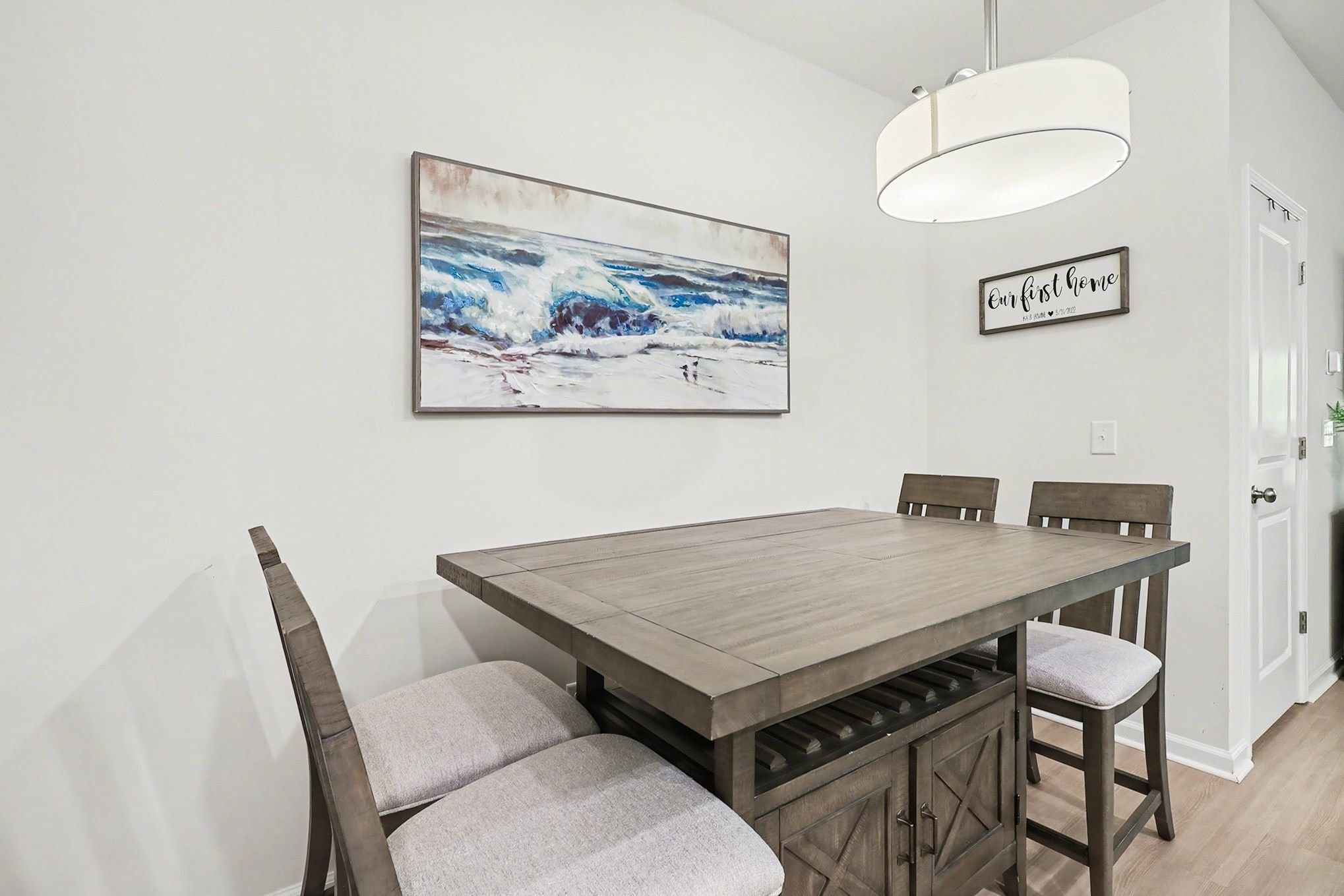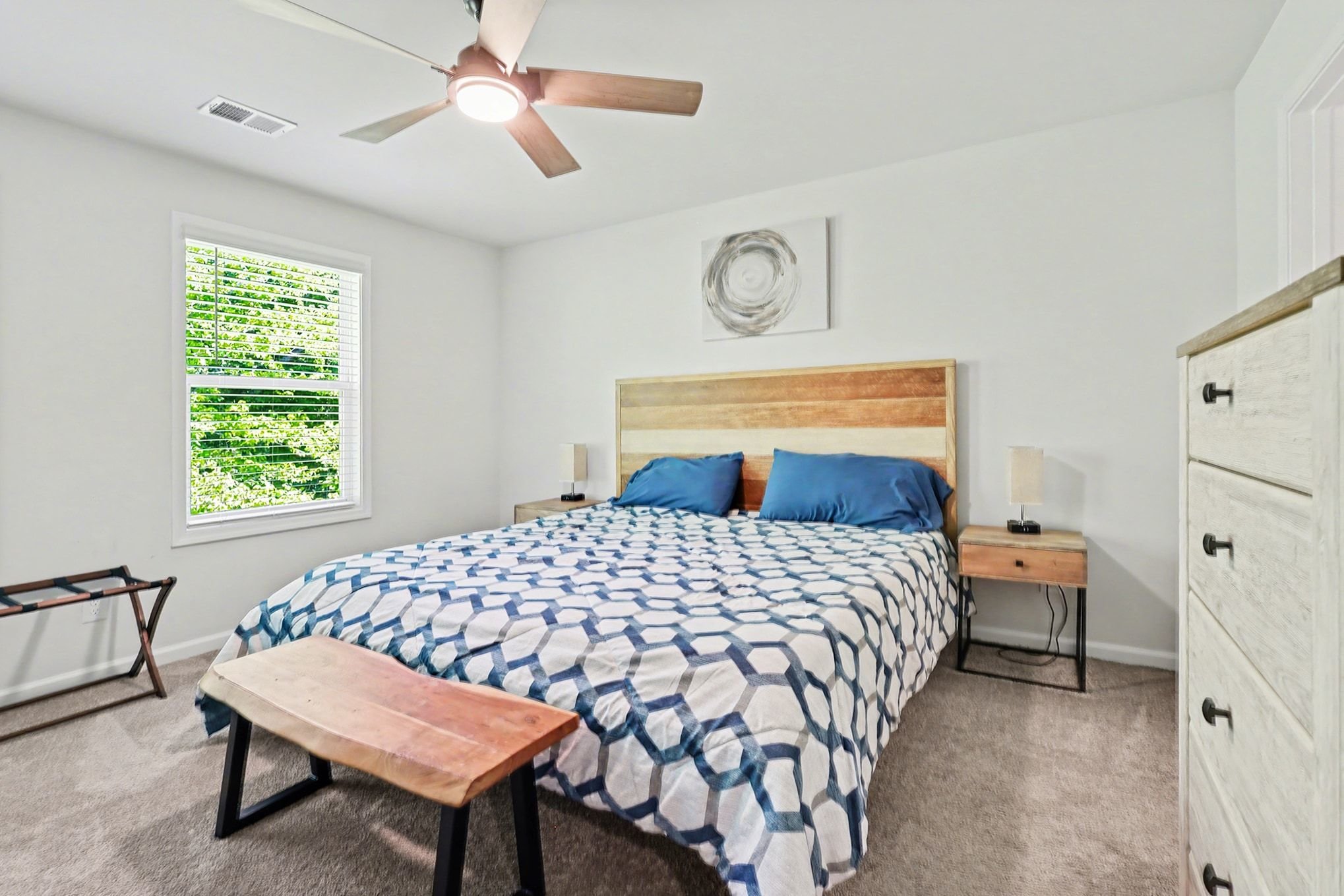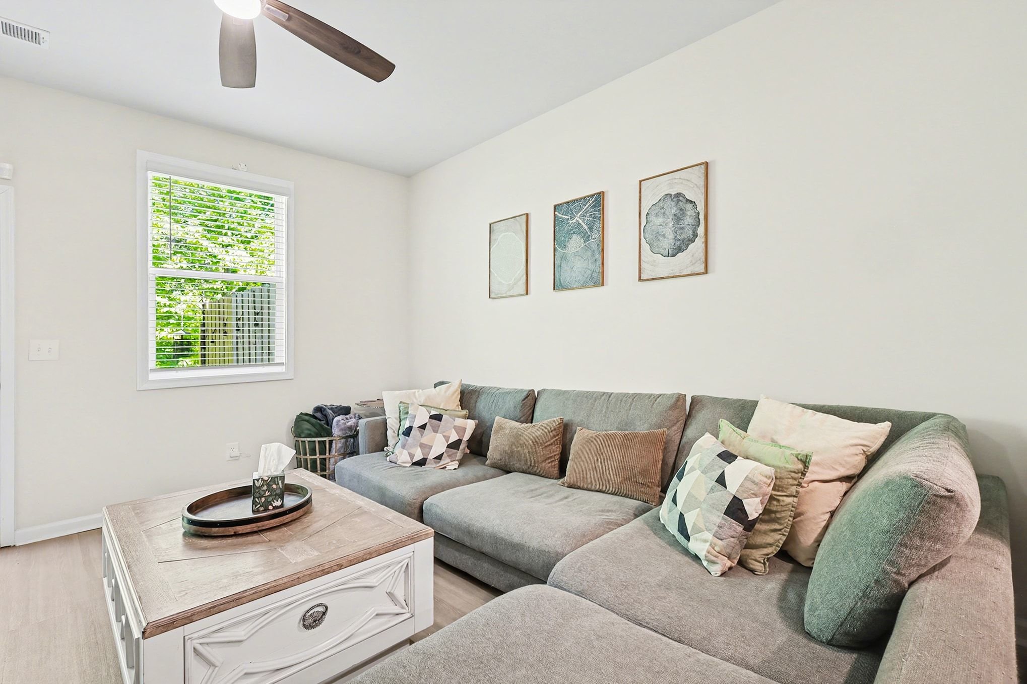 Tucked into a charming Greenville community, this two-bedroom, two-and-a-half-bath townhome offers 1,482 square feet of modern, low-maintenance living with stylish finishes throughout. A fresh exterior with crisp siding, shake accents, and a standout blue front door pairs with an attached one-car garage for both curb appeal and convenience. Inside, the open-concept main floor flows effortlessly between kitchen, dining, and living areas, all anchored by wide plank wood-style flooring and neutral walls. The kitchen impresses with white shaker cabinetry, speckled granite countertops, a full suite of stainless steel appliances including a gas range, and a spacious center island with pendant lighting. A dedicated dining area and a generously sized living room with ceiling fan and mounted TV space complete the downstairs layout. A stylish powder room with a navy vanity adds a designer touch for guests. Upstairs, the primary suite offers a ceiling fan, plush carpeting, and an en-suite bath featuring a glass-enclosed shower, granite vanity, and walk-in closet. The second bedroom is equally well-appointed with its own full bath access, making the home ideal for roommates, guests, or a home office setup. A dedicated laundry room with included washer and dryer adds everyday ease. Step outside to a private fenced patio, and enjoy a location with easy access to Conestee Park, shopping, and downtown Greenville. *Our homes come as-is with all essentials in working order. Want upgrades? Request it through the Belong app, and our trusted pros will take care of the rest!
