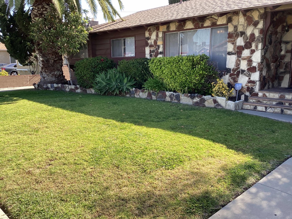 This charming 3-bedroom home exhibits an elegant facade graced with verdant lawn, palm trees, and a stone-laden wall fronted by beautifully-tended shrubs! The home comes with a security alarm installed on its windows and doors for your peace of mind! Upon entry, you are greeted by the large family room, which features solid hardwood floors and a brick wall with a double-sided fireplace! The dining room flows seamlessly into the adjacent kitchen as both areas showcase gorgeous travertine floors. A glass door off the dining area opens to the concrete patio at the back where you can lounge or dine alfresco with your family and friends! Tucked away for extra privacy is the primary bedroom with its his-and-hers built-in closets, along with an ensuite bath complete with a water closet, a walk-in shower, and a vanity with a mirrored medicine cabinet. Two more bedrooms are accessible from the hallway—both have built-in wardrobes with ample space for personal storage, windows for ventilation and natural light, and easy access to a full bath with a tub-and-shower combo! This is a single-family home that shares a large outdoor lot with a multi-unit. It is pet-friendly, has a spacious garage that can accommodate up to two cars, and is located close to grocery stores and schools. Contact us today to see this home for yourself!