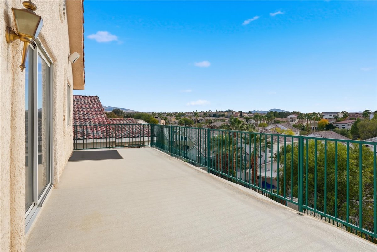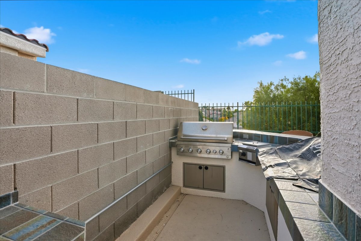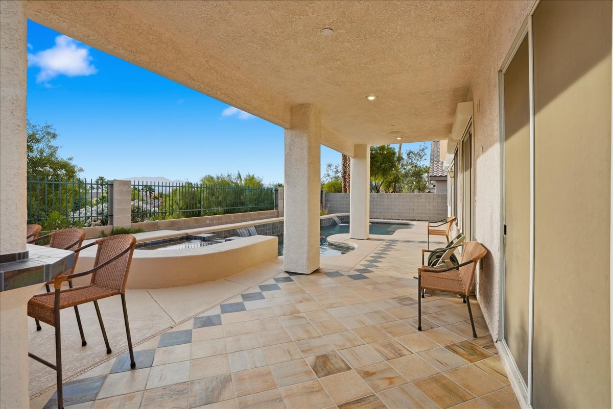 This gorgeous 5-bedroom, 3.5-bath home invites you into a setting designed for upscale living. Its outdoor spaces take center stage, offering a sparkling pool framed by clear sunset views, a built-in grill station, and generous covered areas for lounging or dining al fresco. The living area blends comfort and sophistication with wood-tone flooring, a ceiling fan, and a fireplace surrounded by clean tile lines. Nearby, the kitchen provides abundant cabinet storage, sleek counters, and stainless-steel appliances, along with an island layout that supports both hosting and day-to-day ease. A dedicated wine cellar adds another layer of luxury, offering the perfect spot to store your favorite bottles in style. Two full primary suites offer impressive flexibility. One suite sits on the main level, with direct access to the pool deck and soft carpet underfoot. Its ensuite includes a spacious shower, dual sinks, and a soaking tub by the window. Additional bedrooms are well sized, creating comfortable spaces for guests, work, or hobbies. This location places you moments from several conveniences, including The District at Green Valley Ranch, Whole Foods, Target, and a variety of cafes and restaurants. Parks such as Harmony Park and Paseo Vista Park are also close by, giving you inviting outdoor options for fresh air, recreation, and weekend strolls. *Fireplace is for decorative use only and cannot be used without consent from Belong. *Our homes come as-is with all essentials in working order. Want upgrades? Request it through the Belong app, and our trusted pros will take care of the rest!