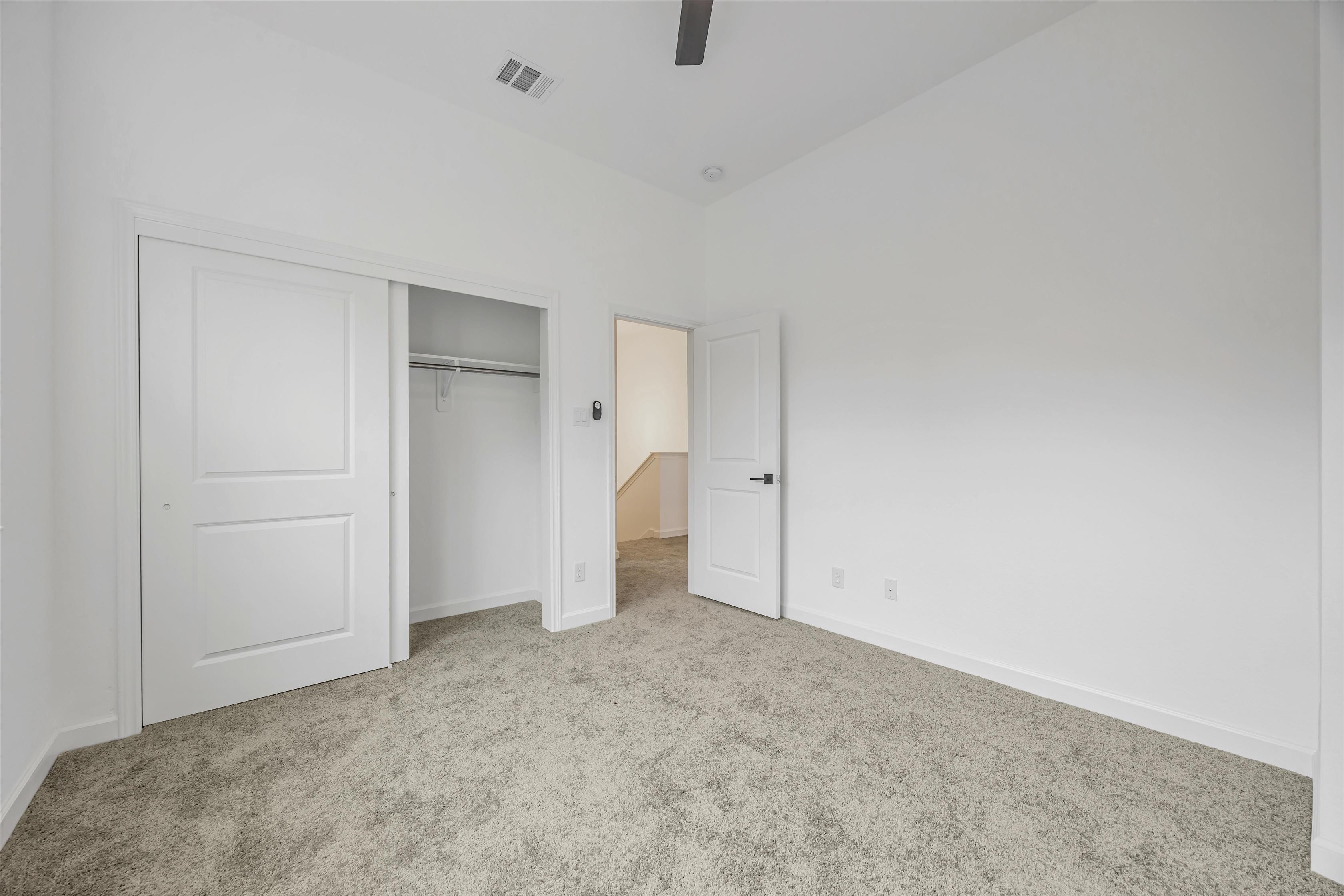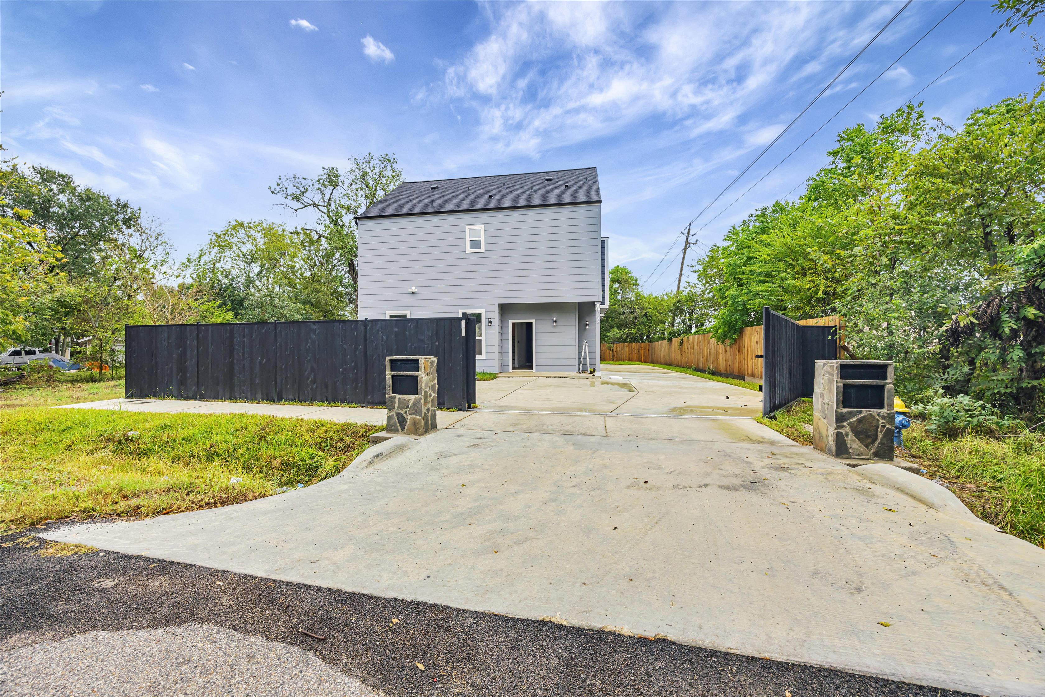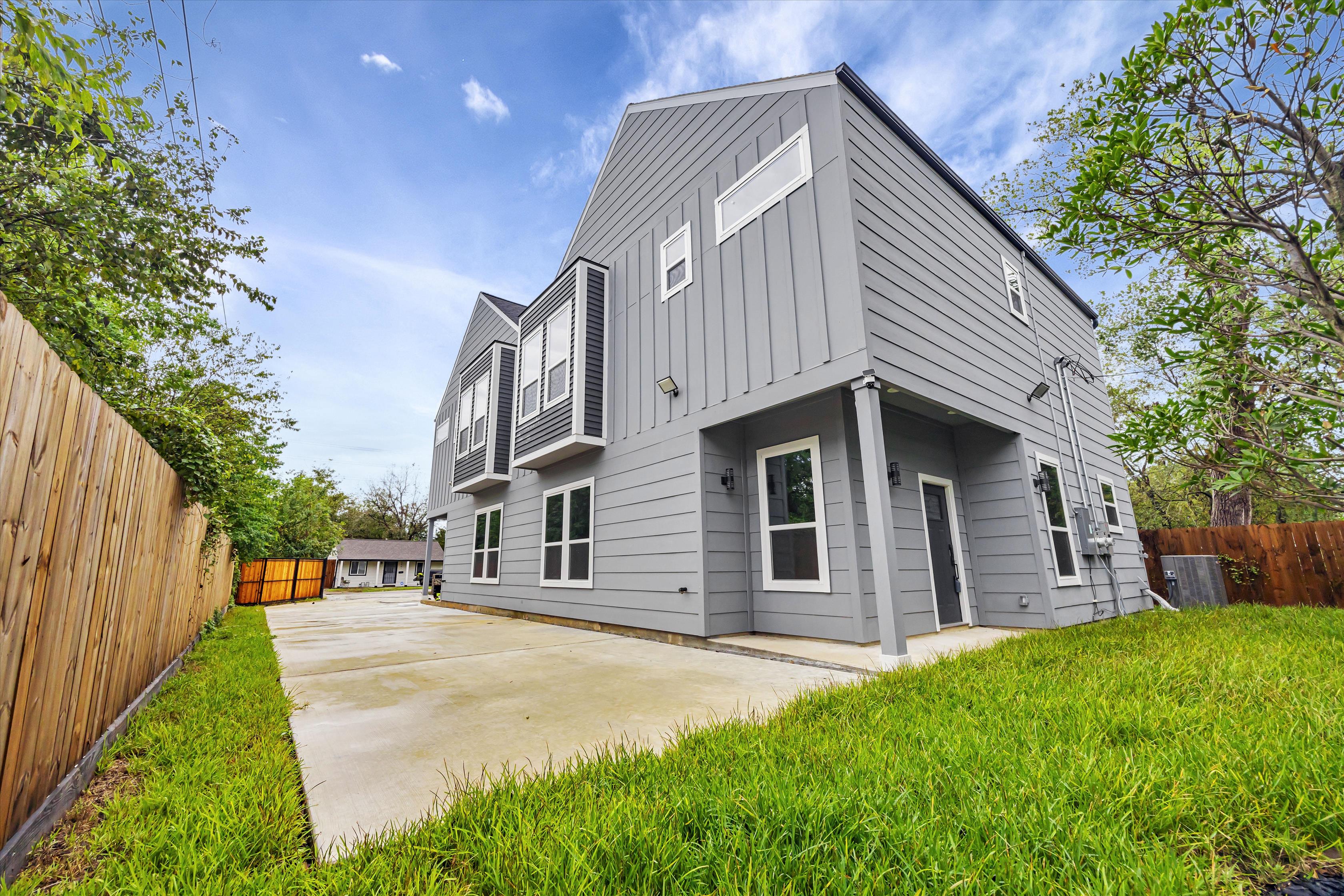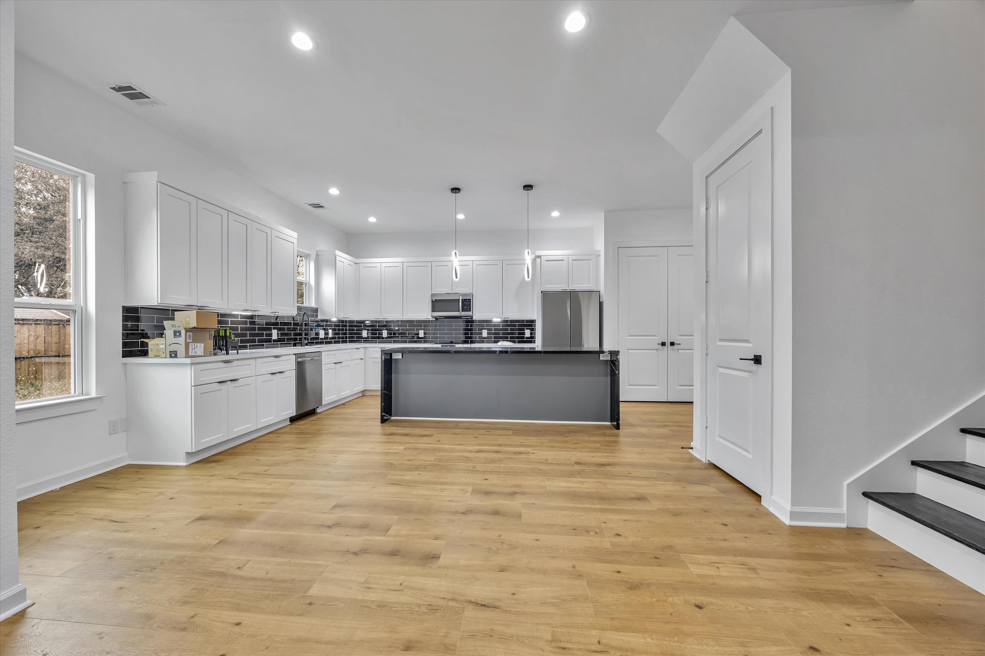 Experience modern elegance at 3402 Nathaniel Brown, a contemporary duplex unit with 3 bedrooms and 2 bathrooms across 1,885 square feet. Thoughtfully designed with an open-concept layout, this newly built home radiates sophistication, featuring hardwood floors and expansive windows that invite abundant natural light throughout. In the living room, a ceiling fan and custom-built shelf create a charming focal point for gatherings, while recessed lighting enhances the home’s clean, polished aesthetic. The kitchen delights with a sleek center island illuminated by pendant lights. A bold black subway tile backsplash, white shaker-style cabinetry, and stainless steel appliances add a modern flair, with ample storage and workspace to inspire creativity. Generously sized and fully carpeted, each bedroom offers a comfortable retreat. The primary suite includes an ensuite bathroom with a double-sink vanity, large mirror, and stylish black fixtures that beautifully contrast against the pristine white walls. A glass-enclosed shower with striking black tiles completes this luxurious bath. Situated on a 5,000 square-foot lot, this pet-friendly home is located in an up-and-coming neighborhood, just minutes from the medical center and NRG Stadium. Balancing stylish design with practicality, this home offers an inviting setting for today’s modern lifestyles.