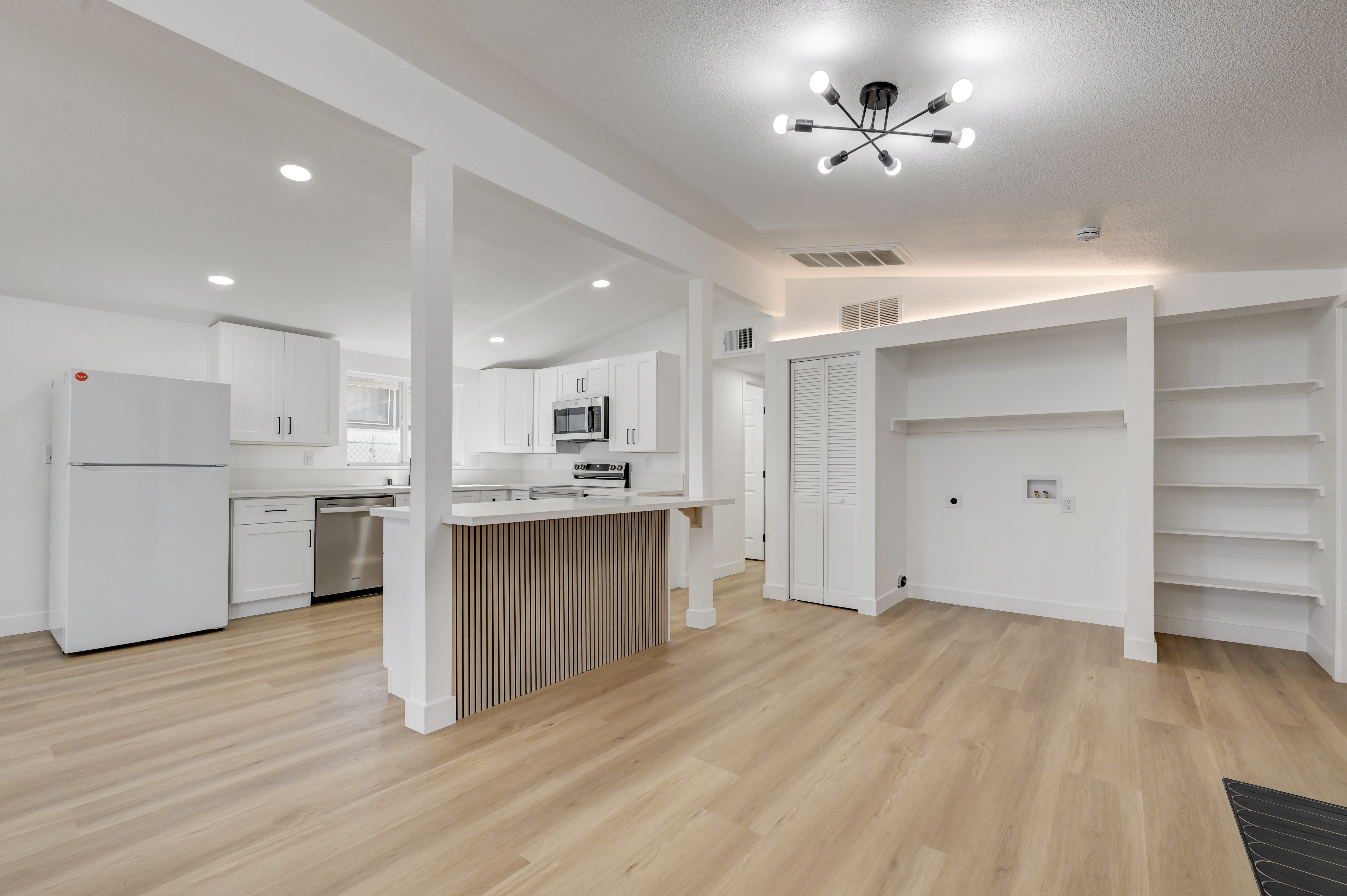 Set in an established Las Vegas neighborhood, this freshly updated single-story home delivers a clean, modern feel with all the comforts of easy desert living. A low-maintenance xeriscaped front yard, mature shade trees, and a crisp stucco facade create an inviting first impression. Inside, an open-concept layout makes the home feel bright and expansive. The kitchen has been thoughtfully designed with white shaker cabinetry, sleek quartz countertops, stainless steel appliances, and a center island that flows seamlessly into the living and dining areas. Light wood-style flooring runs throughout, complemented by recessed lighting and exposed beam accents that add architectural character. A statement black brick fireplace anchors the living room, creating a cozy focal point. Three well-proportioned bedrooms feature soft white walls, generous closets, and the same wide-plank flooring for a cohesive look. Two full bathrooms provide everyday comfort with modern finishes and clean lines. Outside, a spacious fenced yard offers room to relax, garden, or entertain in the warm desert climate. The location places you in a calm residential setting with quick access to shopping, dining, and the major routes that connect you across the Las Vegas valley. *Fireplace is for decorative use only and cannot be used without consent from Belong. *Our homes come as-is with all essentials in working order. Want upgrades? Request it through the Belong app, and our trusted pros will take care of the rest!