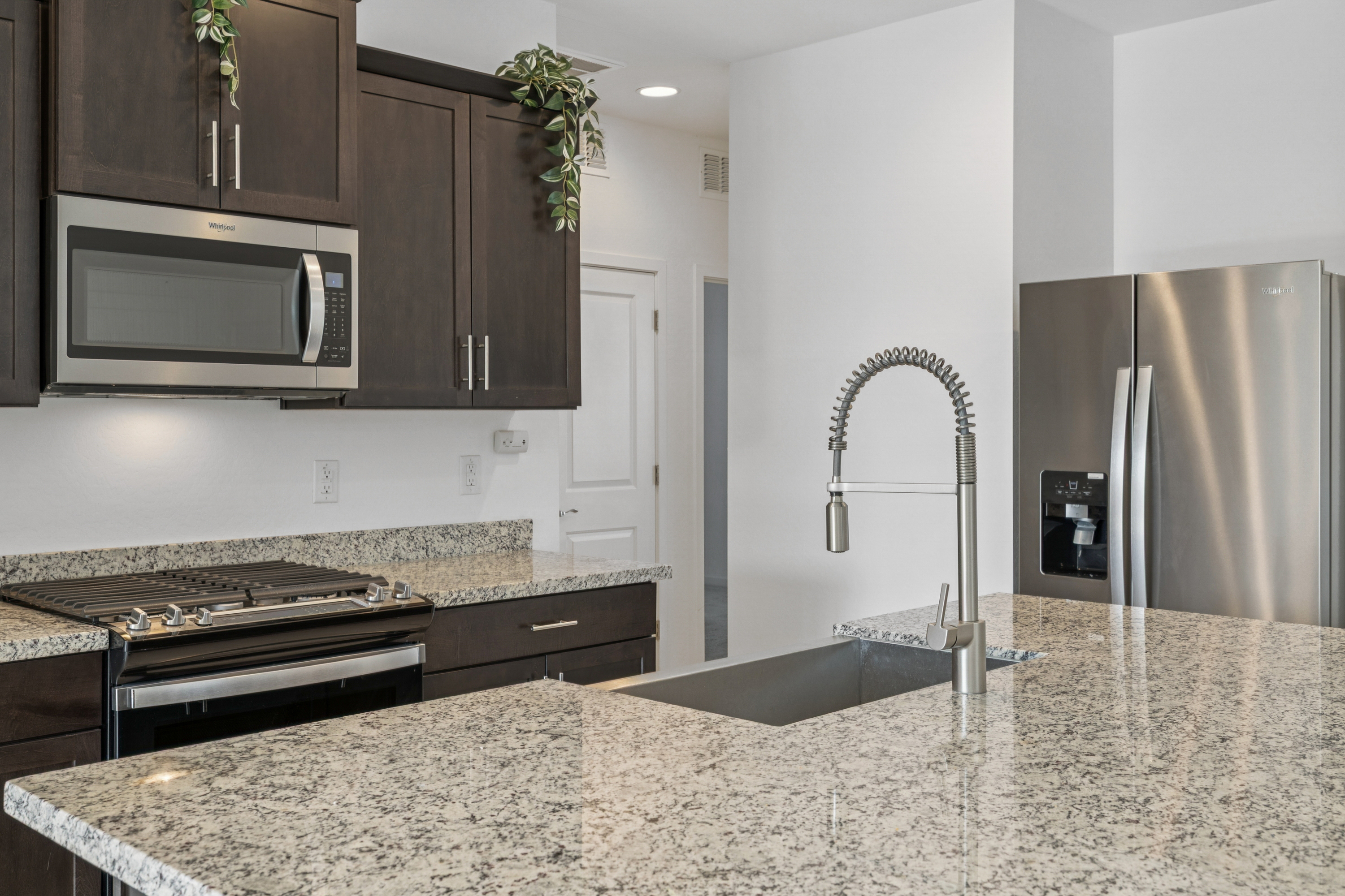 Modern design and everyday comfort come together beautifully in this 3-bedroom, 2-bath home in Laveen Village. The living area offers a relaxed setting with neutral tile underfoot and natural light filtering in through wide windows, creating an inviting spot for movie nights or weekend gatherings. An open layout leads easily into the kitchen, where dark cabinetry contrasts with light stone counters for a sleek look. A large island with seating anchors the space and includes a deep stainless steel sink with a professional-style faucet, perfect for cooking prep or casual meals. Stainless steel appliances and plenty of storage make it a practical hub for both everyday dining and entertaining. Bedrooms are comfortable retreats with ample closet space, while two bathrooms provide both a soaking tub and a step-in shower for flexibility. Everyday routines are simplified with the convenience of in-home laundry, complete with washer and dryer. An attached 2-car garage ensures secure parking and extra storage. Laveen Village balances suburban ease with city access. Fry’s and Safeway are nearby for groceries, and local favorites like Amadio Ranch Farm Store bring fresh produce close to home. Dining and shopping centers are just a short drive away, and access to major roadways makes commuting into Phoenix straightforward. *Our homes come as-is with all essentials in working order. Want upgrades? Request it through the Belong app, and our trusted pros will take care of the rest!