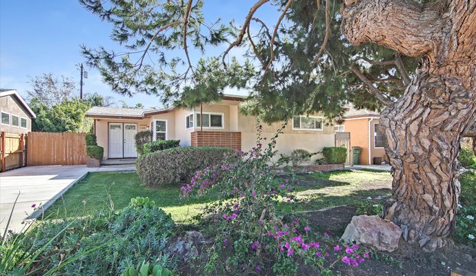 Nestled in the heart of Van Nuys' historic district, this fully updated 3-bedroom, 2-bathroom home blends timeless charm with modern amenities. Its spacious driveway welcomes you into a thoughtfully designed interior featuring tray ceilings, wainscoting, and custom built-ins. Refinished hardwood floors add warmth and elegance throughout the home. The kitchen includes stainless steel appliances, including a 4-burner gas range, microwave, and dishwasher, set against pristine white cabinetry and countertops. Both bathrooms have been tastefully appointed with new toilets and vanities to ensure a fresh and clean ambiance. One of the home's standout features is the expansive rear yard, ideal for hosting outdoor gatherings or enjoying peaceful moments amidst tree-lined surroundings. The concrete patio offers a fantastic spot for al fresco dining, while the lush greenery provides a serene backdrop. Additional amenities include air conditioning, a programmable thermostat, and a security system to ensure comfort and peace of mind. An attached garage, complete with a workbench, offers the flexibility to create a home office or hobby space. This pet-friendly home welcomes your furry companions, too! This address is located within walking distance of essential amenities such as grocery stores, gyms, and metro stops. A short drive brings you to Sherman Oaks, renowned for its vibrant dining and shopping scene, including the Sherman Oaks Galleria and a variety of eateries along Ventura Boulevard. *Washer and dryer will be installed after lease is signed and before move-in. *Fireplace is for decorative use only and cannot be used without consent from Belong. *Our homes come as-is with all essentials in working order. Want upgrades? Request it through the Belong app, and our trusted pros will take care of the rest.