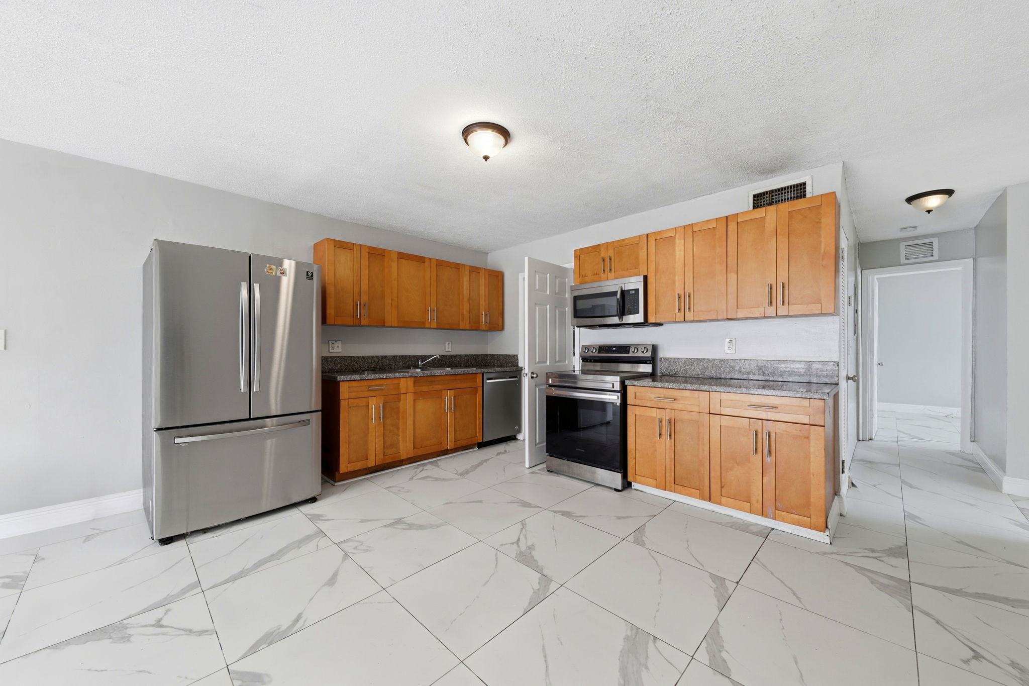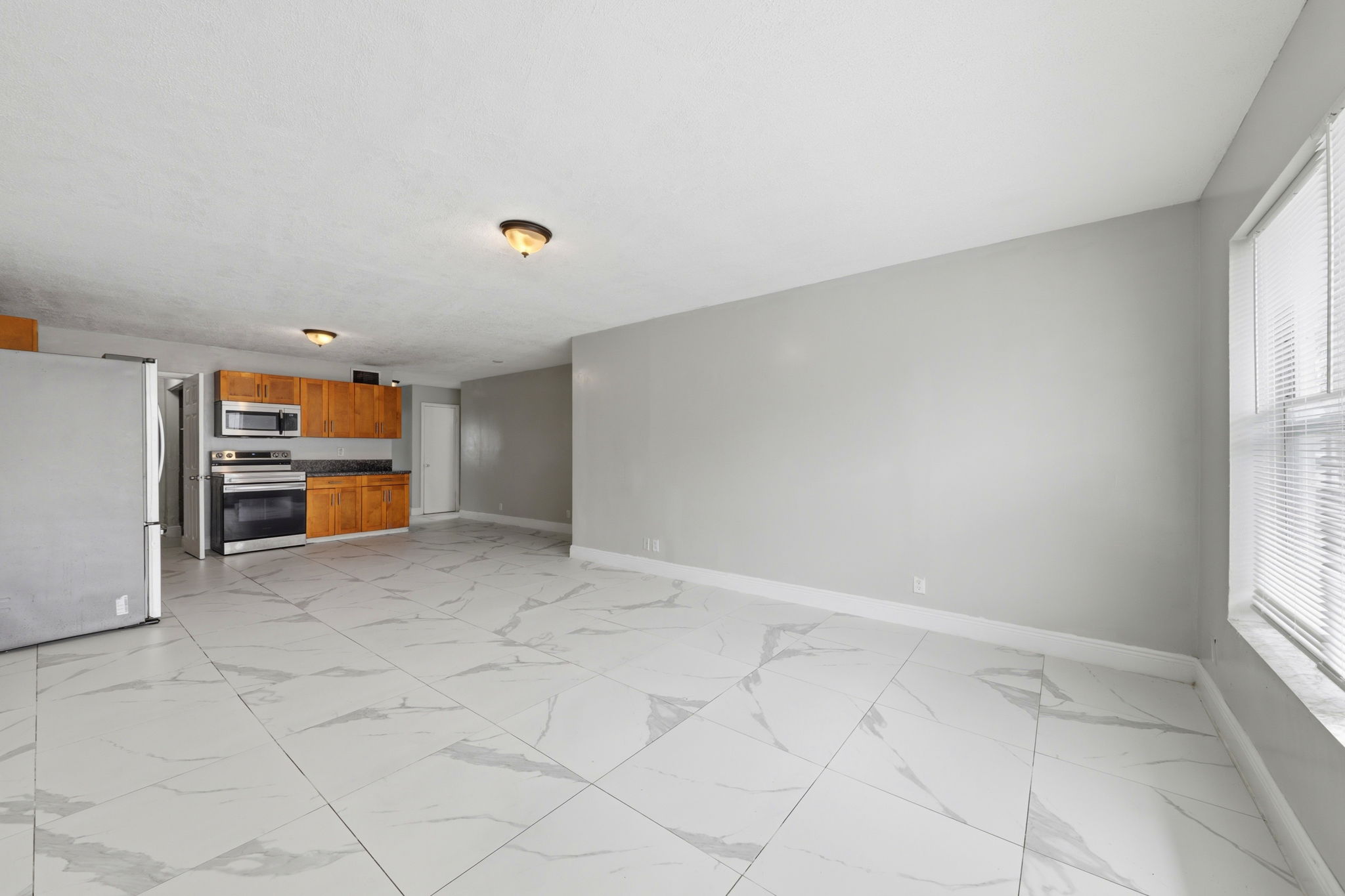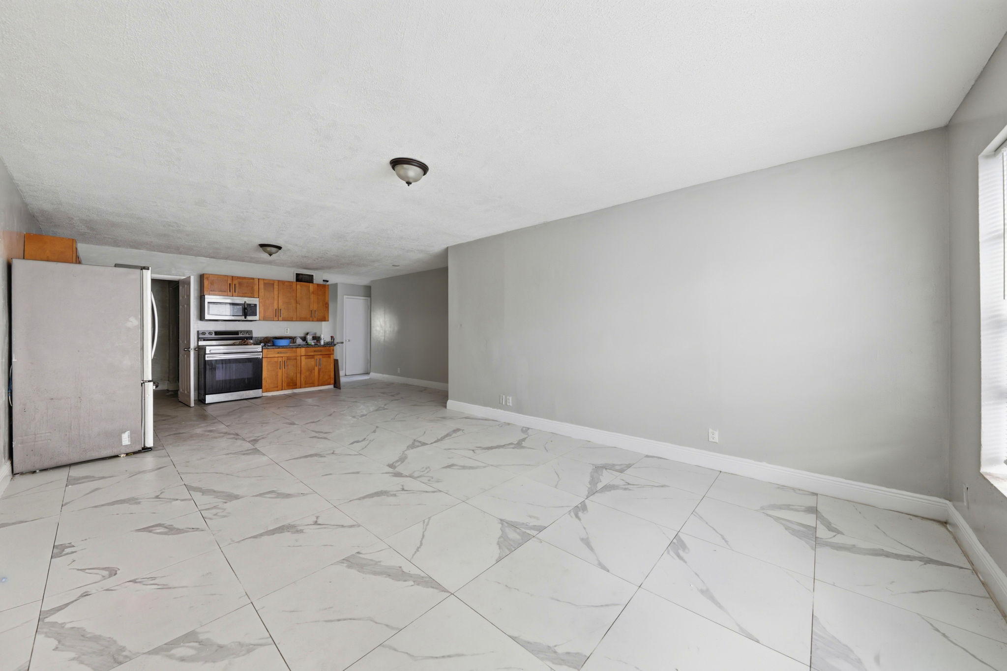Bright space, bold tile flooring, and an open layout give this 3-bedroom, 2-bath home an inviting presence the moment you enter. Large-format tile stretches across the living and dining areas, creating a clean, cohesive foundation that feels fresh and easy to style. Wide windows welcome natural light, while the open arrangement keeps the main gathering areas connected and flexible for daily living or hosting friends. The kitchen stands ready for action. Warm wood cabinetry provides generous storage, while stainless steel appliances - including a refrigerator, oven range, and microwave - deliver dependable functionality. Spacious counters support meal prep, quick breakfasts, or late-night snacks. Everything sits within easy reach, creating a practical workspace that keeps cooking efficient and organized. Location keeps daily errands simple. Grocery shopping is convenient with options such as Presidente Supermarket and Sedano’s nearby, while dining spots along NW 27th Avenue offer a variety of local favorites. Outdoor recreation awaits at nearby Charles Hadley Park and Arcola Lakes Park, and downtown Miami, Wynwood, and the airport remain within a short drive. This central setting keeps the city’s best destinations close at hand. *Our homes come as-is with all essentials in working order. Want upgrades? Request it through the Belong app, and our trusted pros will take care of the rest!