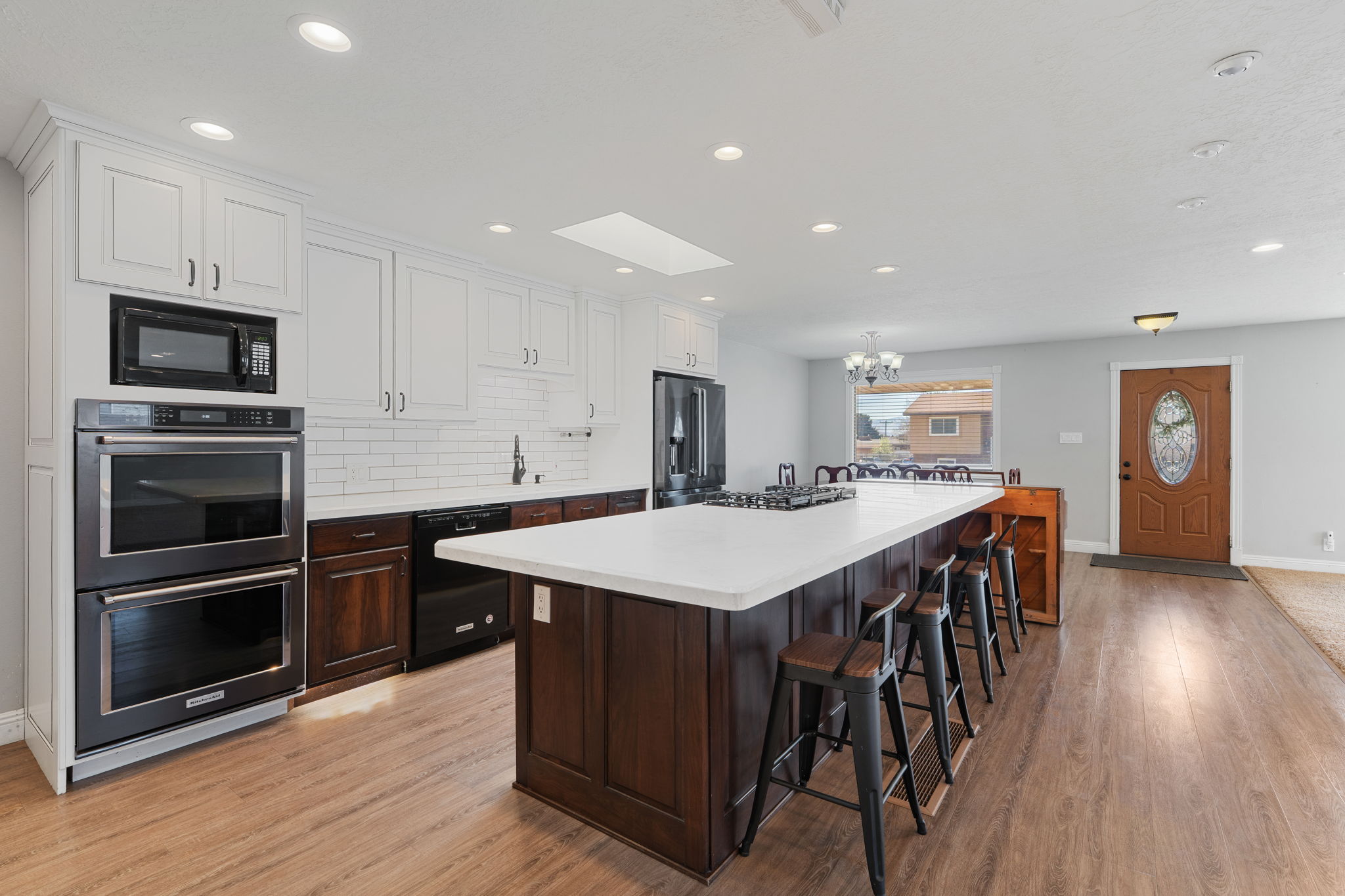 Expansive proportions and a clearly defined open layout shape this 5-bedroom, 3.5-bath home in Utah. Broad sightlines extend across the main living zone, supported by multiple windows that distribute natural light evenly throughout the space. Solar integration and built-in tech elements contribute to long-term efficiency and modern functionality. Carpeted surfaces define the primary gathering space, while adjacent wood-toned flooring introduces a subtle transition toward the kitchen and dining zones. Recessed ceiling lights are distributed throughout, creating consistent overhead illumination. Kitchen areas are organized for both scale and separation of use. The main kitchen features extensive cabinetry, a wide island with an integrated cooktop, and bar seating for casual dining or prep overflow. A secondary kitchen provides additional utility, complete with its own cabinetry, sink, and cooking area, along with nearby storage access. This dual-kitchen configuration supports varied household needs and parallel use. Five bedrooms offer practical square footage, while 3.5 bathrooms are distributed to support access across levels. Located in a well-established part of Orem, this home is near grocery options like Harmons, along with retail and dining at University Place. Additional shopping is available at Provo Towne Centre, and nearby parks and outdoor areas across the city provide access to recreation and open space. *Our homes come as-is with all essentials in working order. Want upgrades? Request it through the Belong app, and our trusted pros will take care of the rest!