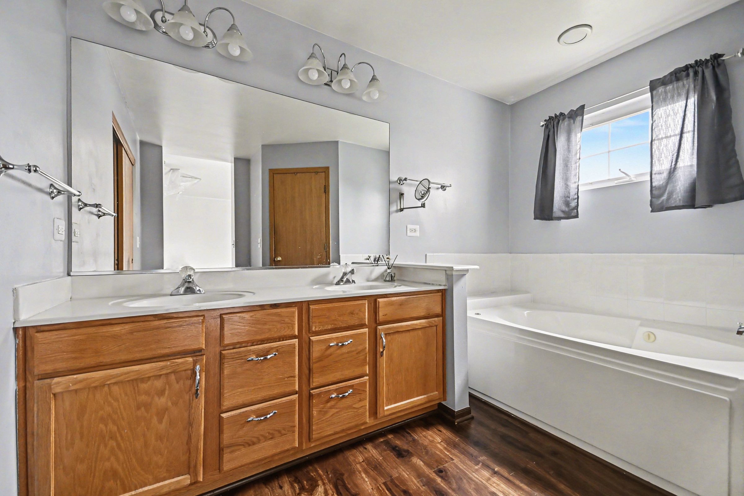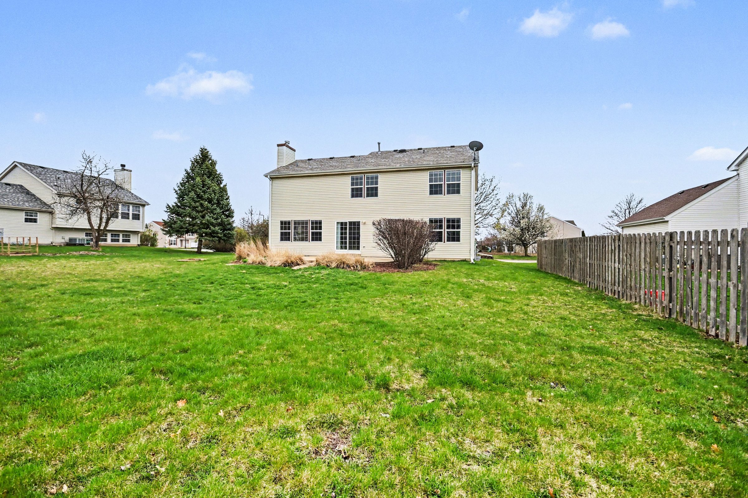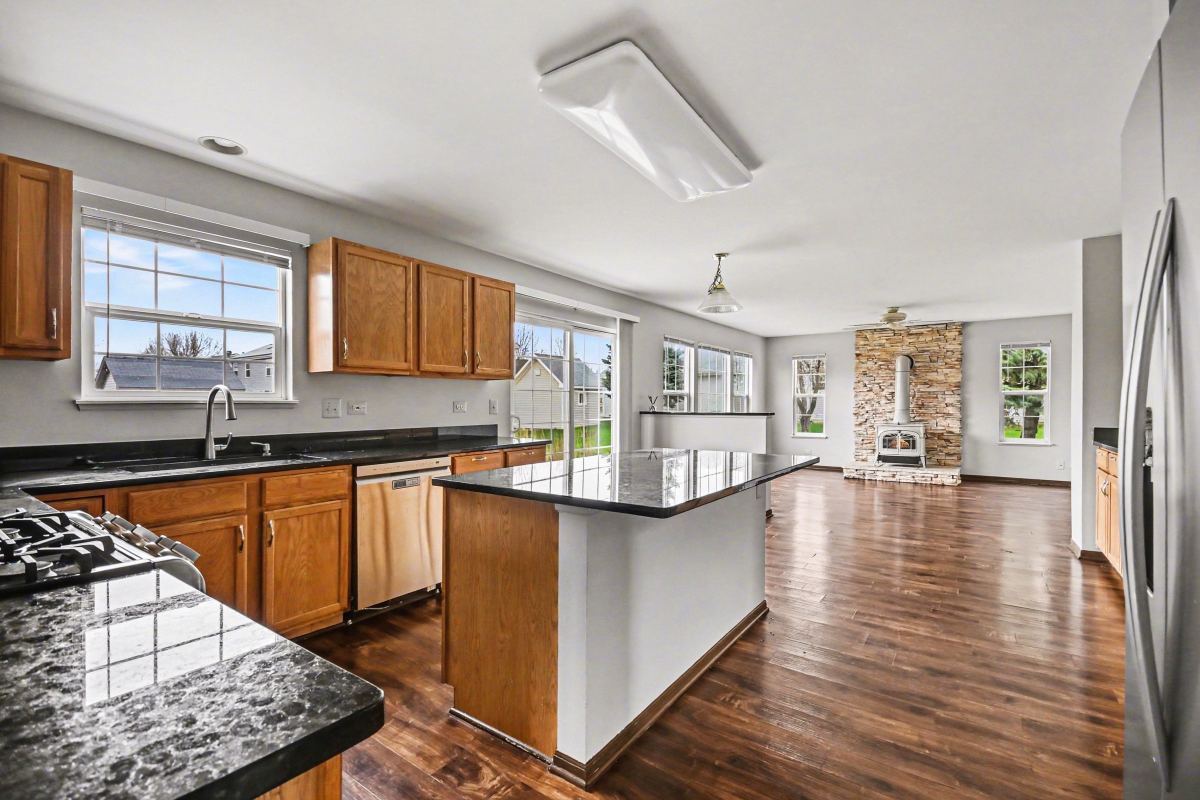 A traditional four-bedroom home in Oswego's established residential fabric, offering 2,310 square feet of well-organized space with a handful of features that set it apart from the standard suburban rental. The living room is the home's centerpiece: rich dark hardwood floors run throughout the main level, and a floor-to-ceiling stacked stone accent wall frames a wood-burning stove that gives the space a warmth most homes at this size don't have. Arched doorways connect to the dining area and kitchen, keeping the layout open without sacrificing definition. The kitchen works around a central island, dark granite countertops, and honey-toned cabinetry with a clear sightline to the backyard through generous windows. Upstairs, four bedrooms provide room to grow, each carpeted and naturally lit. The secondary bedrooms are well-proportioned with solid closet space, and the 2.5-bath count handles morning routines without friction. Out back, a wide, fenced yard with a large lawn gives kids and pets real room to use. The neighborhood sits close to the Route 34 corridor, putting Sam's Club, Walmart, Best Buy, and Lou Malnati's within a few minutes. Rush Copley Medical Center and Oswego East High School are both nearby, rounding out the practical appeal of the location. *Our homes come as-is with all essentials in working order. Want upgrades? Request it through the Belong app, and our trusted pros will take care of the rest!