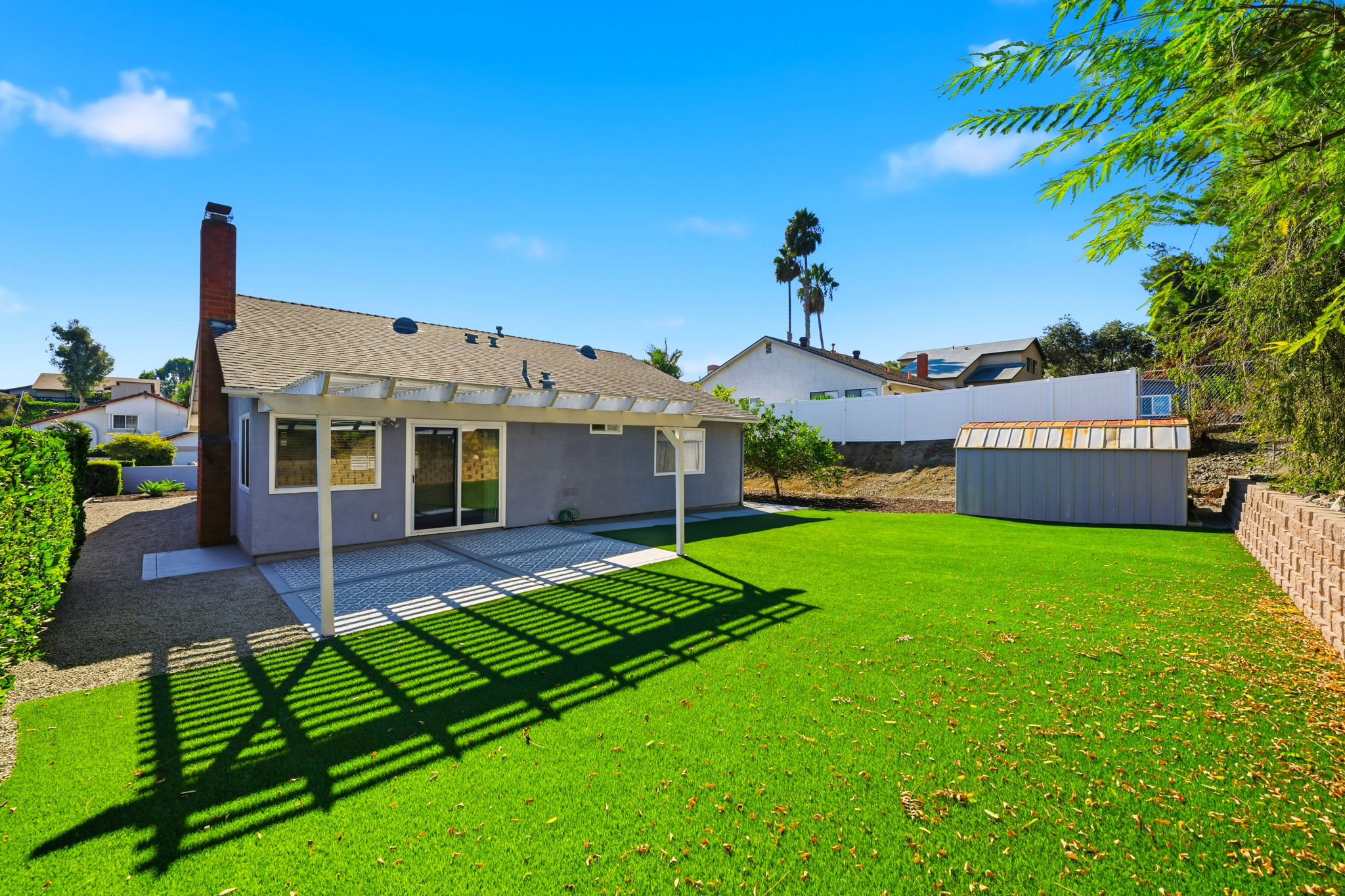 Mountain views, open living spaces, and a peaceful neighborhood make this 3-bedroom, 2-bath home in Rancho Bernardo feel both welcoming and refined. The living area is centered around a gas fireplace, offering a comfortable place to relax while vaulted ceilings and wide windows draw in natural light. A whole-house fan adds comfort and energy efficiency, complemented by a tankless water heater. Steps away, the kitchen’s generous counter space and stainless steel appliances create a functional yet stylish setting for home-cooked meals. A peninsula with bar seating invites casual dining, while the adjoining dining nook overlooks the fenced backyard—perfect for entertaining or simply enjoying the quiet view. Each bedroom offers calm, private comfort, while the empty tool shed provides convenient storage for outdoor or hobby equipment. The 2-car garage completes this ranch-style layout with everyday practicality. You’ll love the setting - no neighbors behind, just open hillside and fresh air. Within a 5-minute drive, you’ll find grocery favorites like Vons, Ralphs, Sprouts, Jimbo’s, Target, and Barons, plus local restaurants and cafés to explore. Award-winning schools and parks sit nearby, including the elementary school just a short walk away, making daily life in this tranquil pocket of North San Diego both easy and enriching. *Fireplace is for decorative use only and cannot be used without consent from Belong. *Our homes come as-is with all essentials in working order. Want upgrades? Request it through the Belong app, and our trusted pros will take care of the rest!