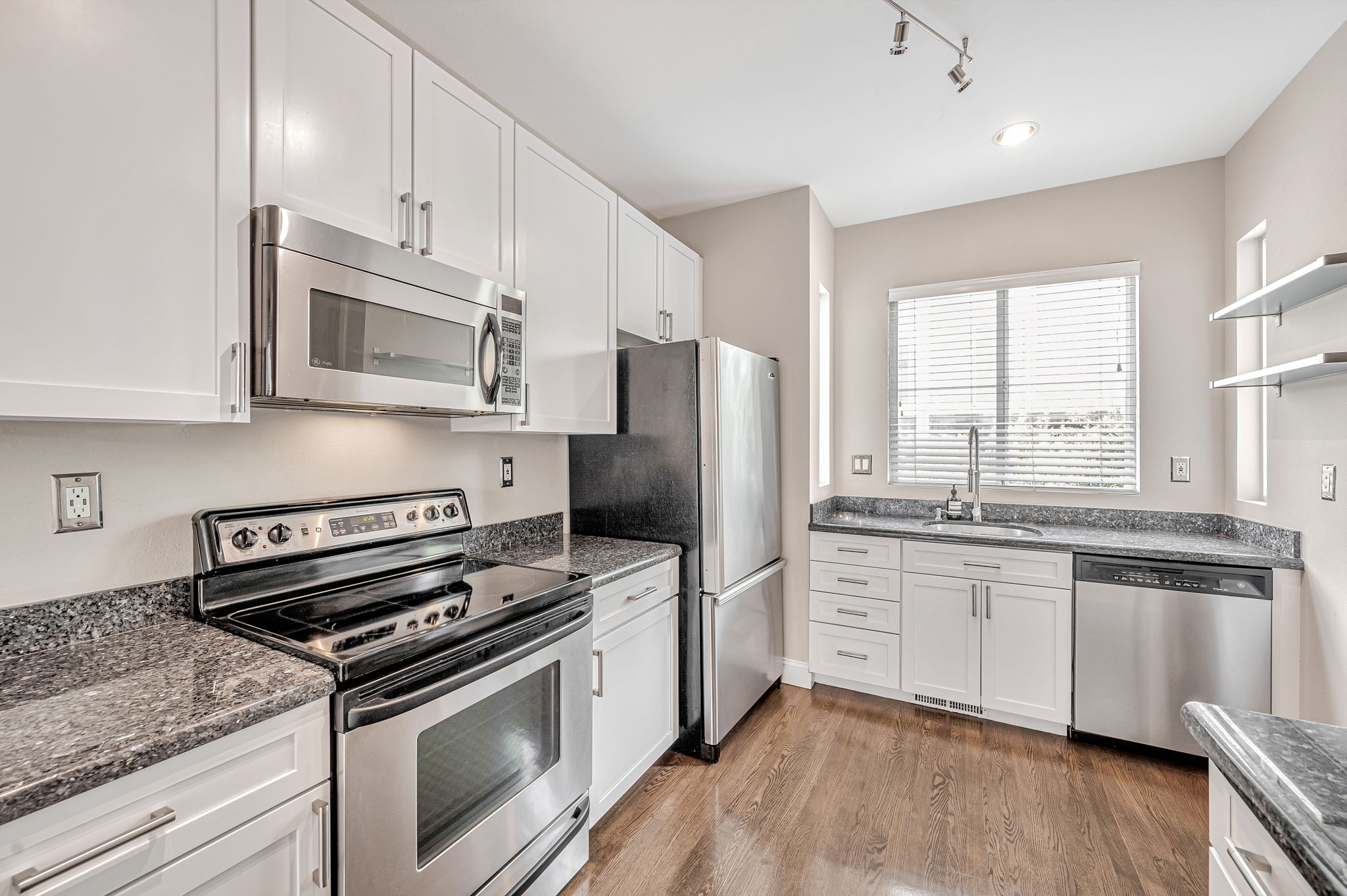 This immaculate 2-bedroom, 1-bathroom home sits on a beautiful tree-lined street in the Yerba Buena area of SoMa. Designed for comfort and convenience, it maximizes space while offering modern upgrades for a seamless city living experience. Hardwood floors stretch across every room, creating a warm and cohesive feel. Large windows fill the split-level main living area with natural light, enhancing the open and airy layout. The kitchen, equipped with stainless steel appliances and granite countertops, flows into the living and dining space, where a private balcony overlooks the common courtyard. Smart home automation and switches bring added convenience to your daily routine. Upstairs, two well-proportioned bedrooms provide privacy and comfort, while the full bathroom includes a skylight that brings in natural light. The lower level offers even more functionality with a one-car garage, built-in storage, and an in-unit washer and dryer. This prime location puts you close to the best of San Francisco. Yerba Buena Gardens, SFMOMA, and the Yerba Buena Center for the Arts are just minutes away. Excellent dining, shopping, and nightlife options are all within walking distance. And with easy access to BART, Caltrain, and freeway entrances, commuting is effortless. *Our homes come as-is with all essentials in working order. Want upgrades? Request it through the Belong app, and our trusted pros will take care of the rest!