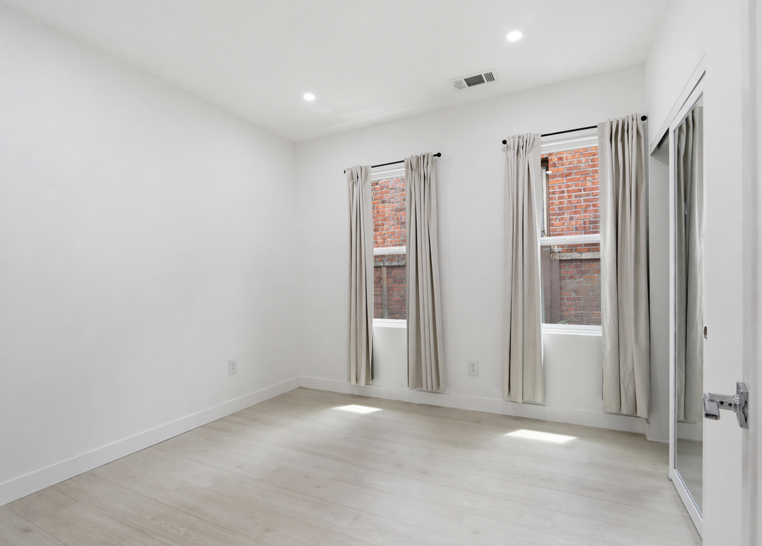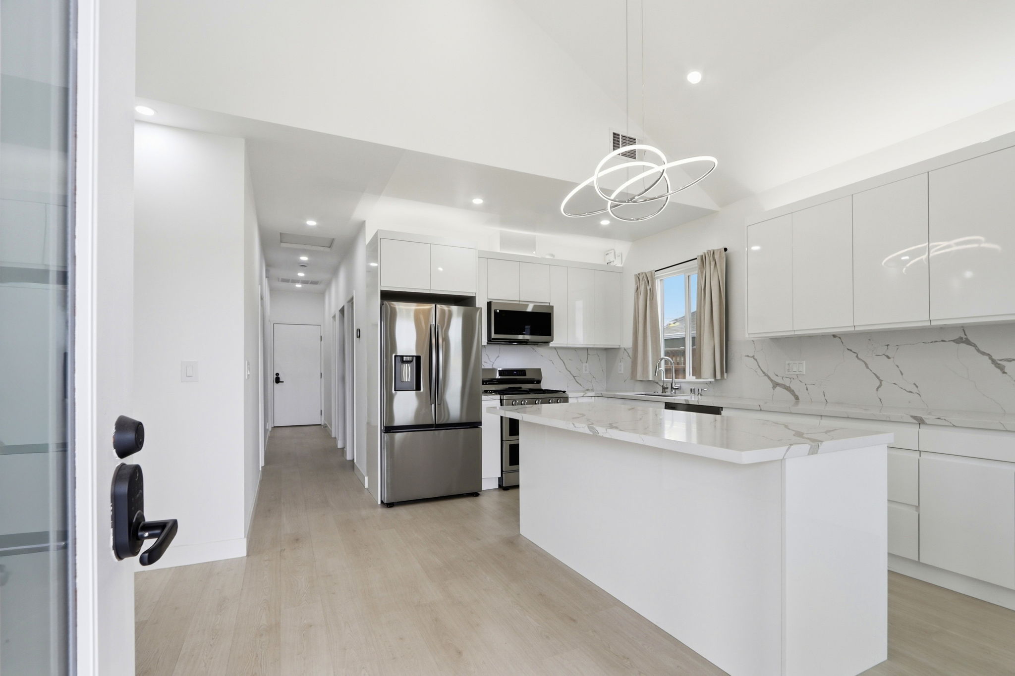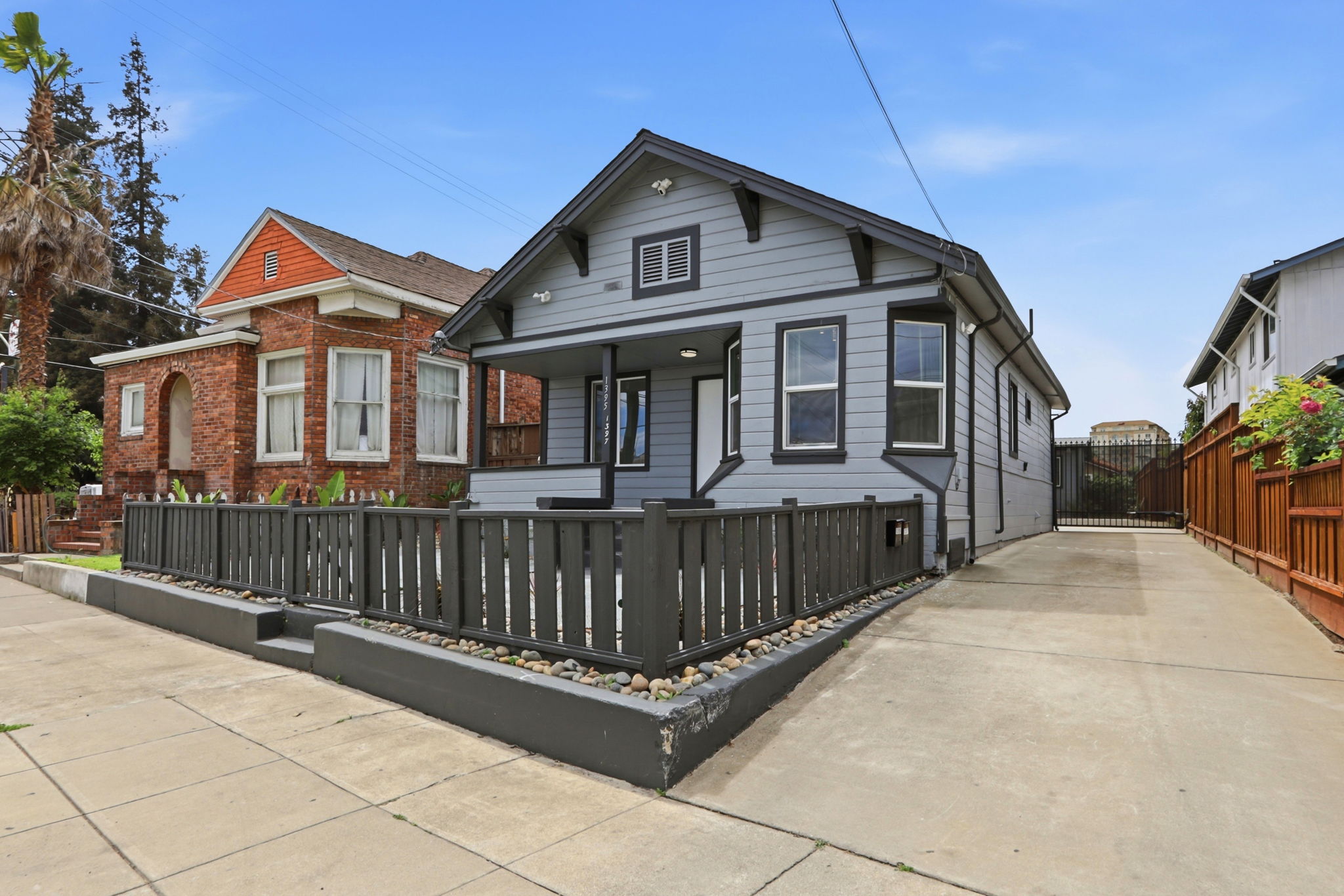 Fully reimagined with contemporary style, this three-bedroom, one-bath Craftsman bungalow in San Jose delivers 1,500 square feet of bright, open living in the heart of Silicon Valley. A classic gabled roofline and slate-gray siding pair with a covered front porch and a fenced yard, giving the home strong street presence with lasting character. Inside, soaring vaulted ceilings and wide plank wood-style flooring set a dramatic tone for the open concept main living space. The showpiece kitchen features high-gloss white cabinetry, a stunning marble-look island with waterfall edges, and a full suite of stainless steel appliances including a double oven gas range and French door refrigerator. Sculptural pendant lighting and a modern ring chandelier add striking designer details, while a custom built-in bay window banquette provides a sunny, built-in dining nook with extra storage. The three bedrooms are finished in crisp white with sleek wood-style flooring, mirrored closet doors, and tailored drapery. One bedroom opens directly onto a private patio through a large sliding glass door, offering a flexible indoor-outdoor retreat. The spa-like bathroom features a marble-style shower with frameless glass enclosure, a quartz vanity, and polished chrome fixtures. A private gated driveway, modern finishes throughout, and a central location near major tech hubs, dining, and downtown amenities make this home a rare urban find. *Our homes come as-is with all essentials in working order. Want upgrades? Request it through the Belong app, and our trusted pros will take care of the rest!