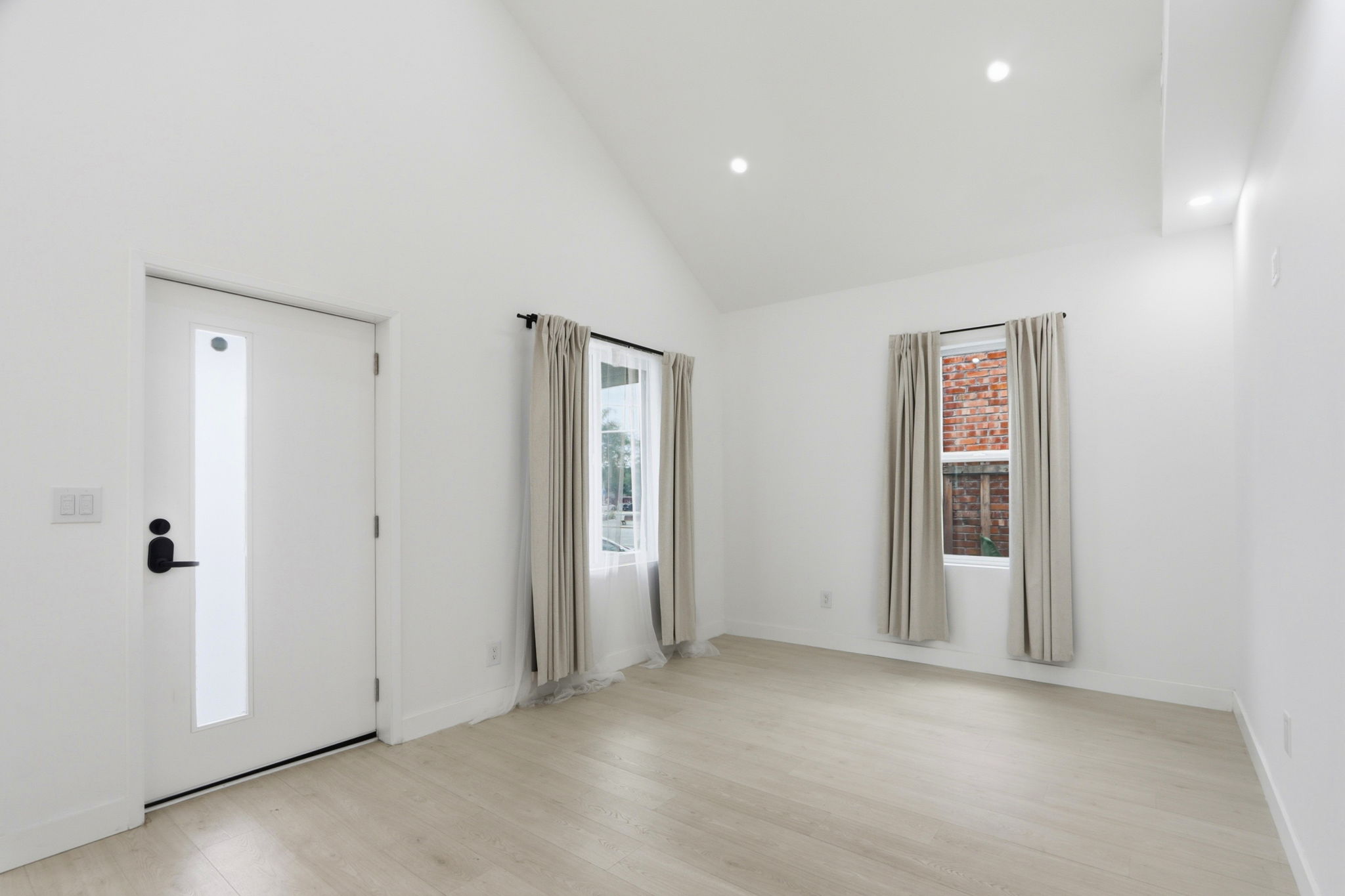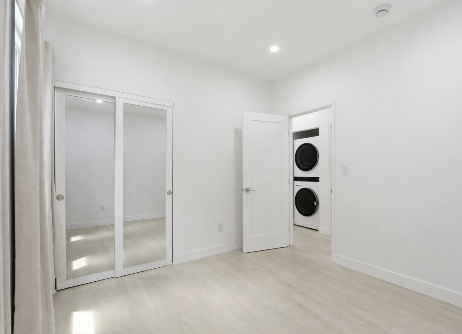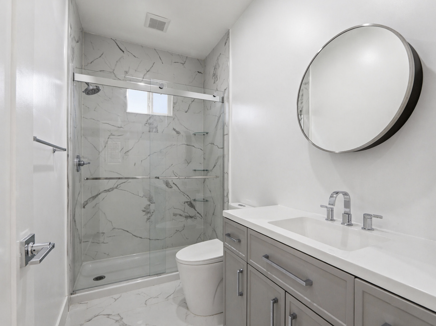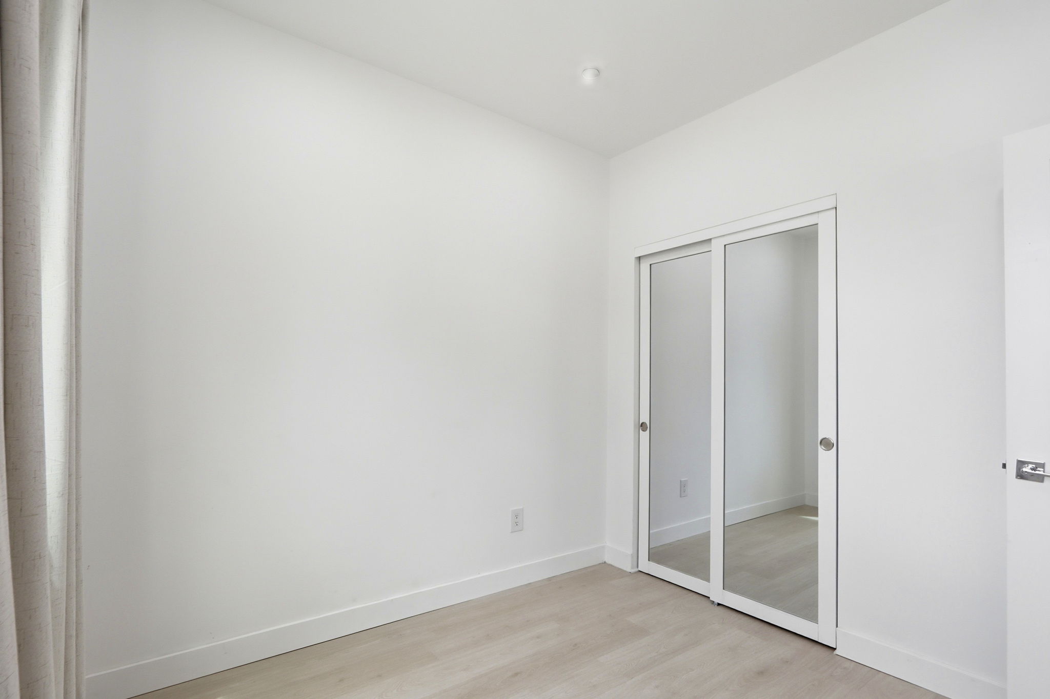 Fully reimagined with contemporary style, this three-bedroom, one-bath Craftsman bungalow in San Jose delivers 1,500 square feet of bright, open living in the heart of Silicon Valley. A classic gabled roofline and slate-gray siding pair with a covered front porch and a fenced yard, giving the home strong street presence with lasting character. Inside, soaring vaulted ceilings and wide plank wood-style flooring set a dramatic tone for the open concept main living space. The showpiece kitchen features high-gloss white cabinetry, a stunning marble-look island with waterfall edges, and a full suite of stainless steel appliances including a double oven gas range and French door refrigerator. Sculptural pendant lighting and a modern ring chandelier add striking designer details, while a custom built-in bay window banquette provides a sunny, built-in dining nook with extra storage. The three bedrooms are finished in crisp white with sleek wood-style flooring, mirrored closet doors, and tailored drapery. One bedroom opens directly onto a private patio through a large sliding glass door, offering a flexible indoor-outdoor retreat. The spa-like bathroom features a marble-style shower with frameless glass enclosure, a quartz vanity, and polished chrome fixtures. A private gated driveway, modern finishes throughout, and a central location near major tech hubs, dining, and downtown amenities make this home a rare urban find. *Our homes come as-is with all essentials in working order. Want upgrades? Request it through the Belong app, and our trusted pros will take care of the rest!