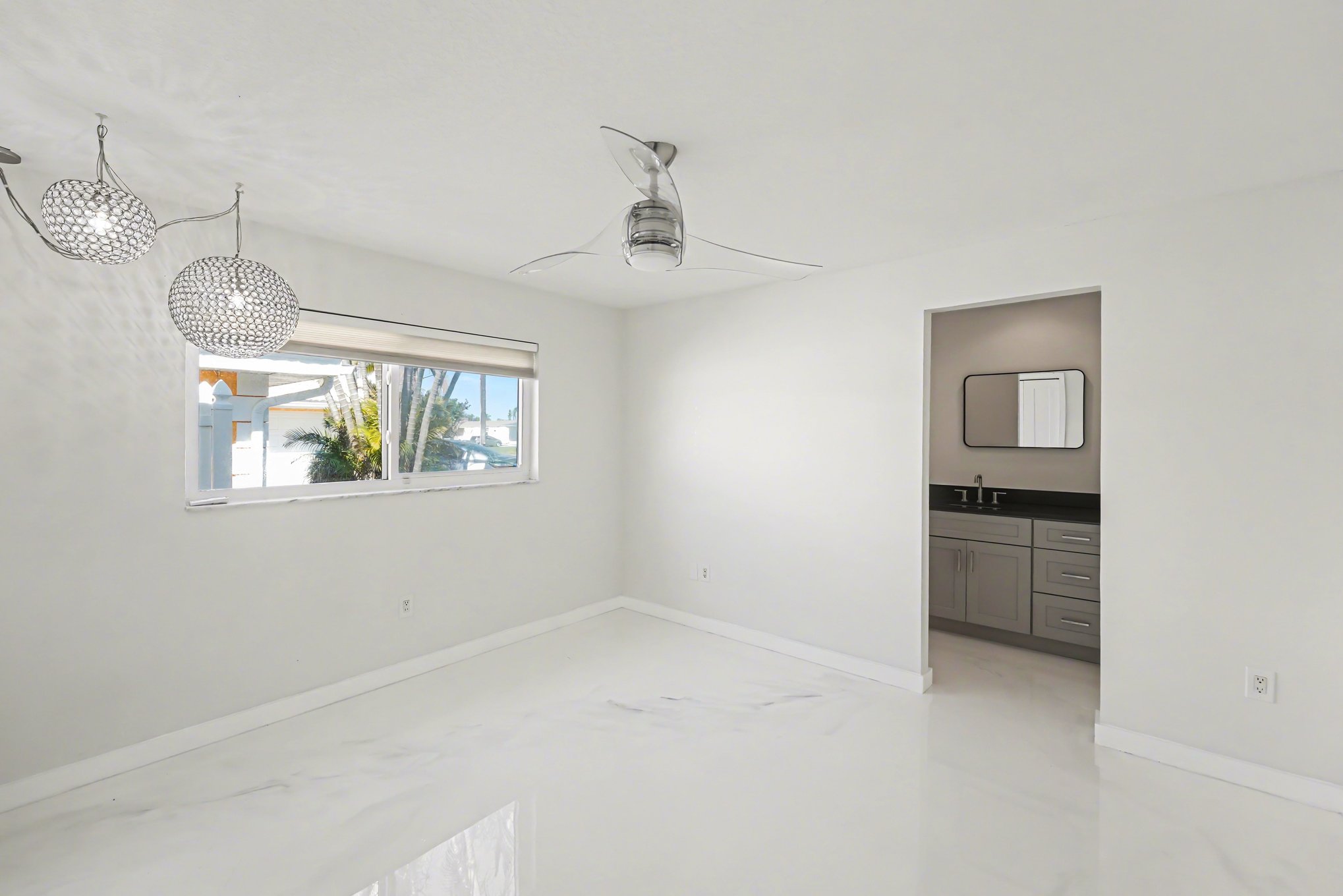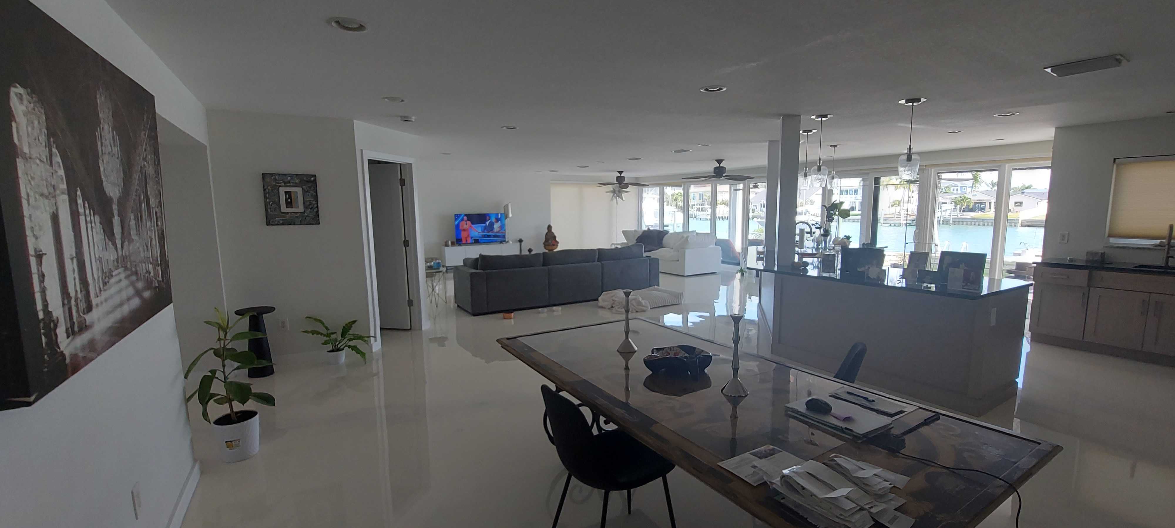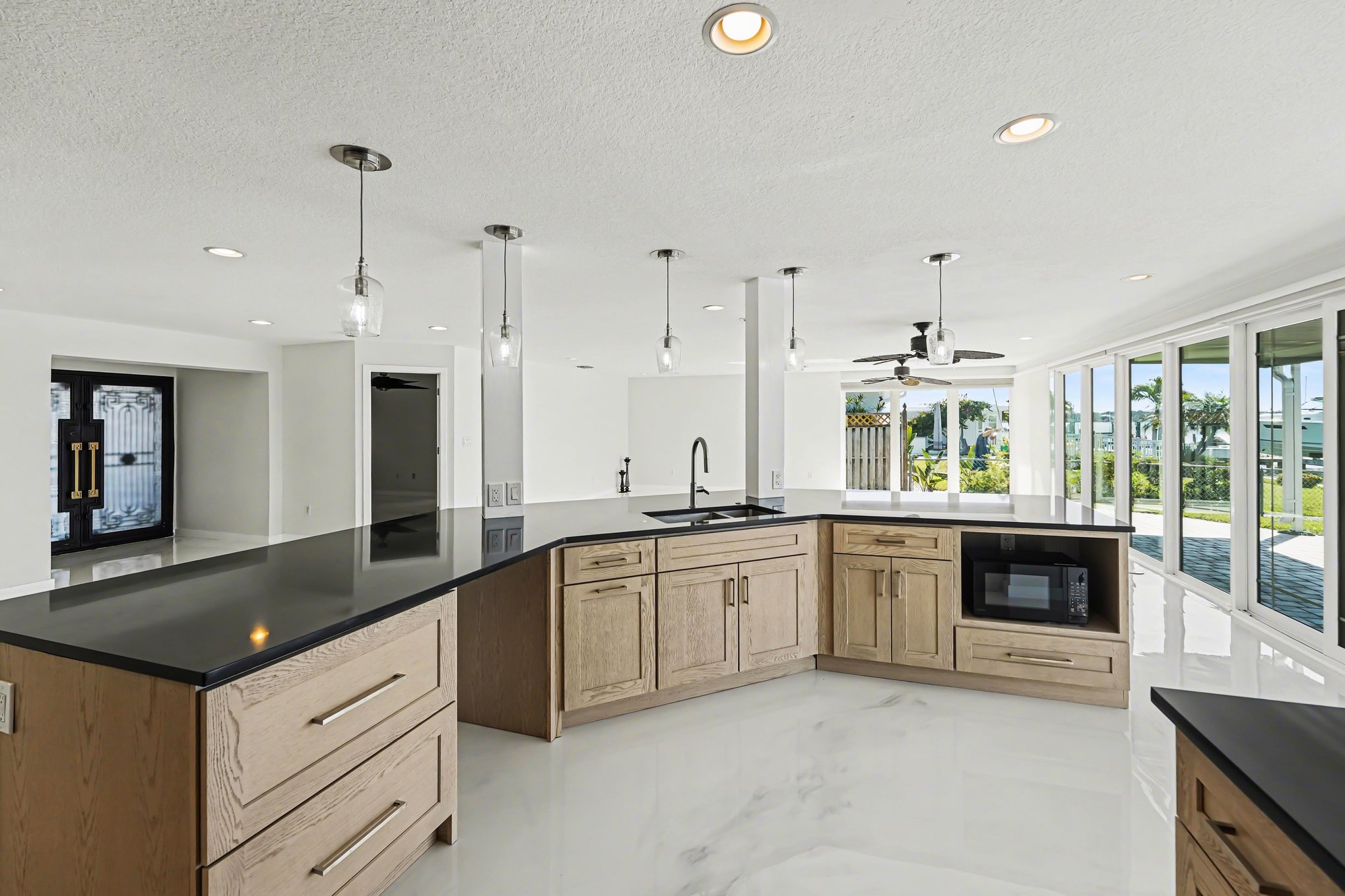 This meticulously maintained single-story ranch blends modern design with waterfront living in Treasure Island. Spanning over 2,100 square feet, the home offers seamless indoor-outdoor flow featuring a private pool and dock access framed by palm-lined landscaping and a spacious paved patio. Inside, the open concept layout is flooded with natural light through floor-to-ceiling windows showcasing serene water views. White tile floors and ceiling fans keep the space fresh and inviting. The kitchen stands out with light wood-tone cabinetry, black granite countertops, and a large island with bar seating under pendant lighting, perfect for entertaining or casual meals. Three carpeted bedrooms provide calm retreats with ample closets, ceiling fans, and large windows outfitted with shades. The three bathrooms impress with walk-in glass showers, sleek modern fixtures, and elegant stone countertops. Laundry is convenient in the dedicated room with front-loading washer and dryer, complemented by white cabinetry and black counters for a unified look. Set in a peaceful, well-connected neighborhood, this home offers relaxed yet accessible coastal living, ideal for those seeking comfort without compromising lifestyle. *Our homes come as-is with all essentials in working order. Want upgrades? Request it through the Belong app, and our trusted pros will take care of the rest!
