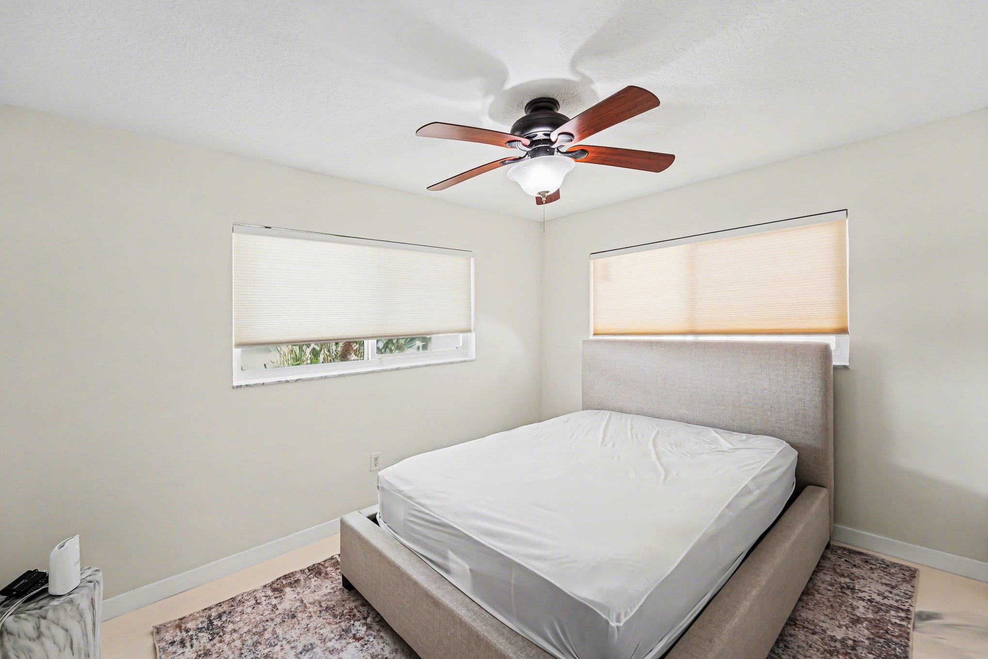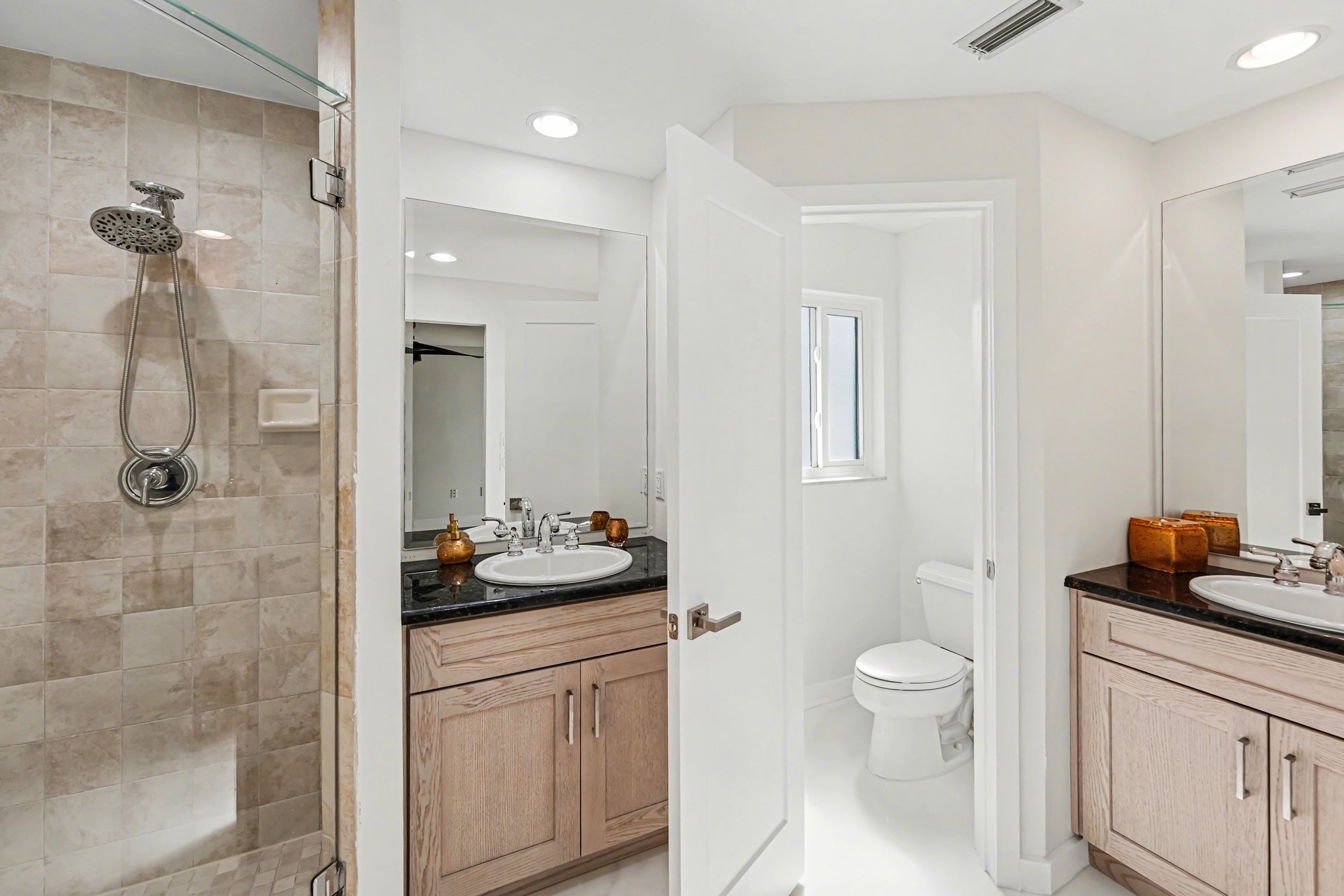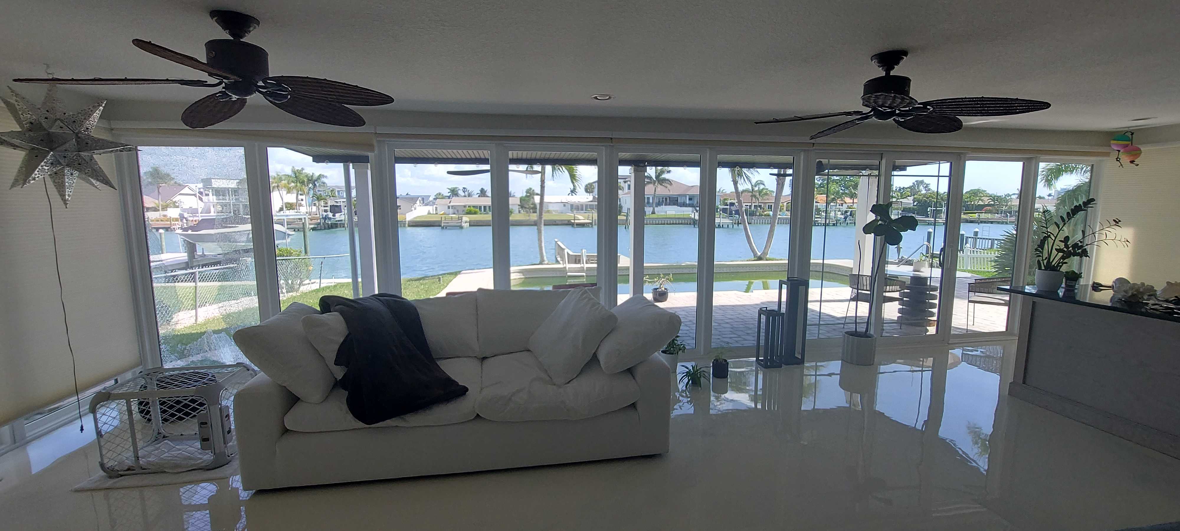 This meticulously maintained single-story ranch blends modern design with waterfront living in Treasure Island. Spanning over 2,100 square feet, the home offers seamless indoor-outdoor flow featuring a private pool and dock access framed by palm-lined landscaping and a spacious paved patio. Inside, the open concept layout is flooded with natural light through floor-to-ceiling windows showcasing serene water views. White tile floors and ceiling fans keep the space fresh and inviting. The kitchen stands out with light wood-tone cabinetry, black granite countertops, and a large island with bar seating under pendant lighting, perfect for entertaining or casual meals. Three carpeted bedrooms provide calm retreats with ample closets, ceiling fans, and large windows outfitted with shades. The three bathrooms impress with walk-in glass showers, sleek modern fixtures, and elegant stone countertops. Laundry is convenient in the dedicated room with front-loading washer and dryer, complemented by white cabinetry and black counters for a unified look. Set in a peaceful, well-connected neighborhood, this home offers relaxed yet accessible coastal living, ideal for those seeking comfort without compromising lifestyle. *Our homes come as-is with all essentials in working order. Want upgrades? Request it through the Belong app, and our trusted pros will take care of the rest!
